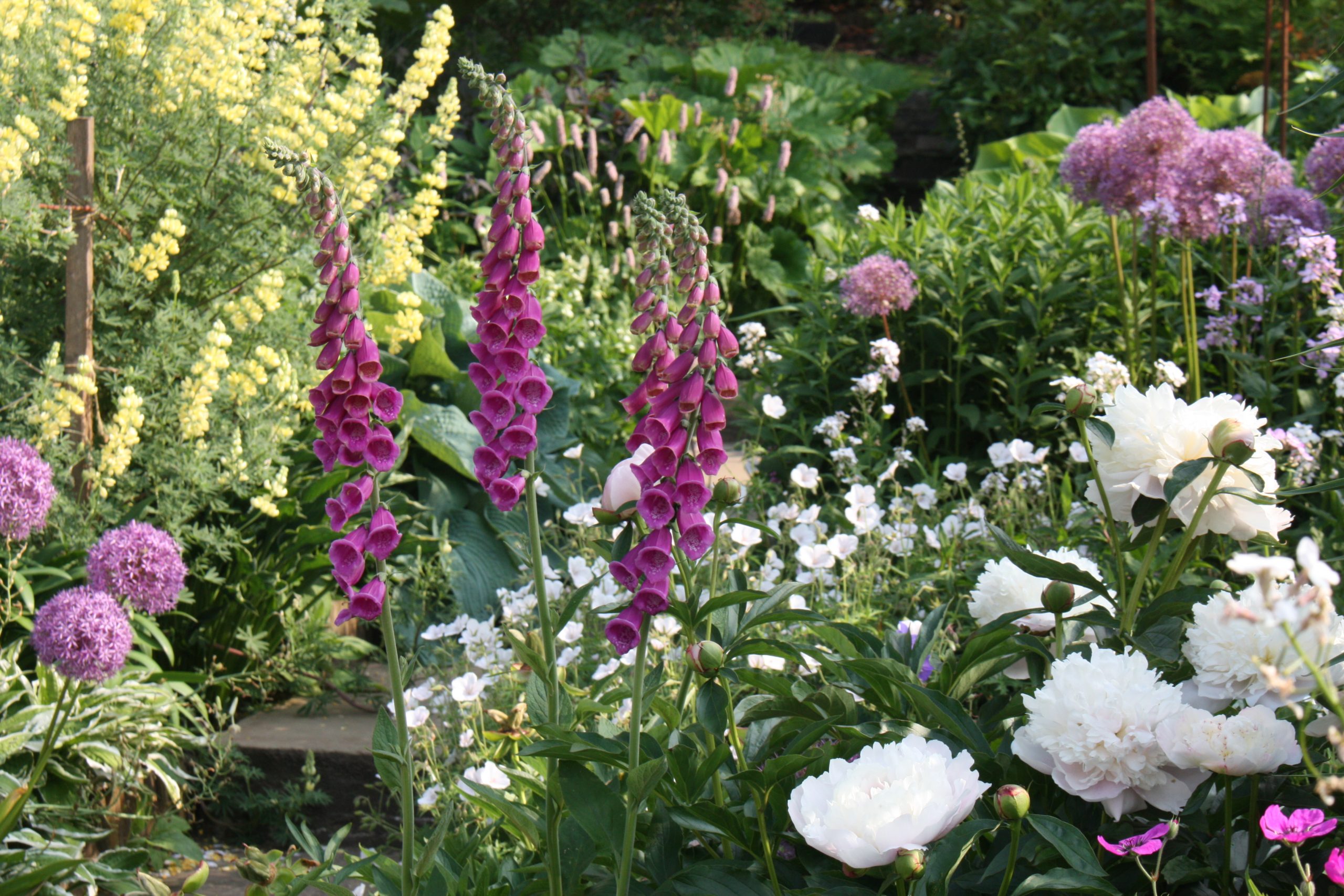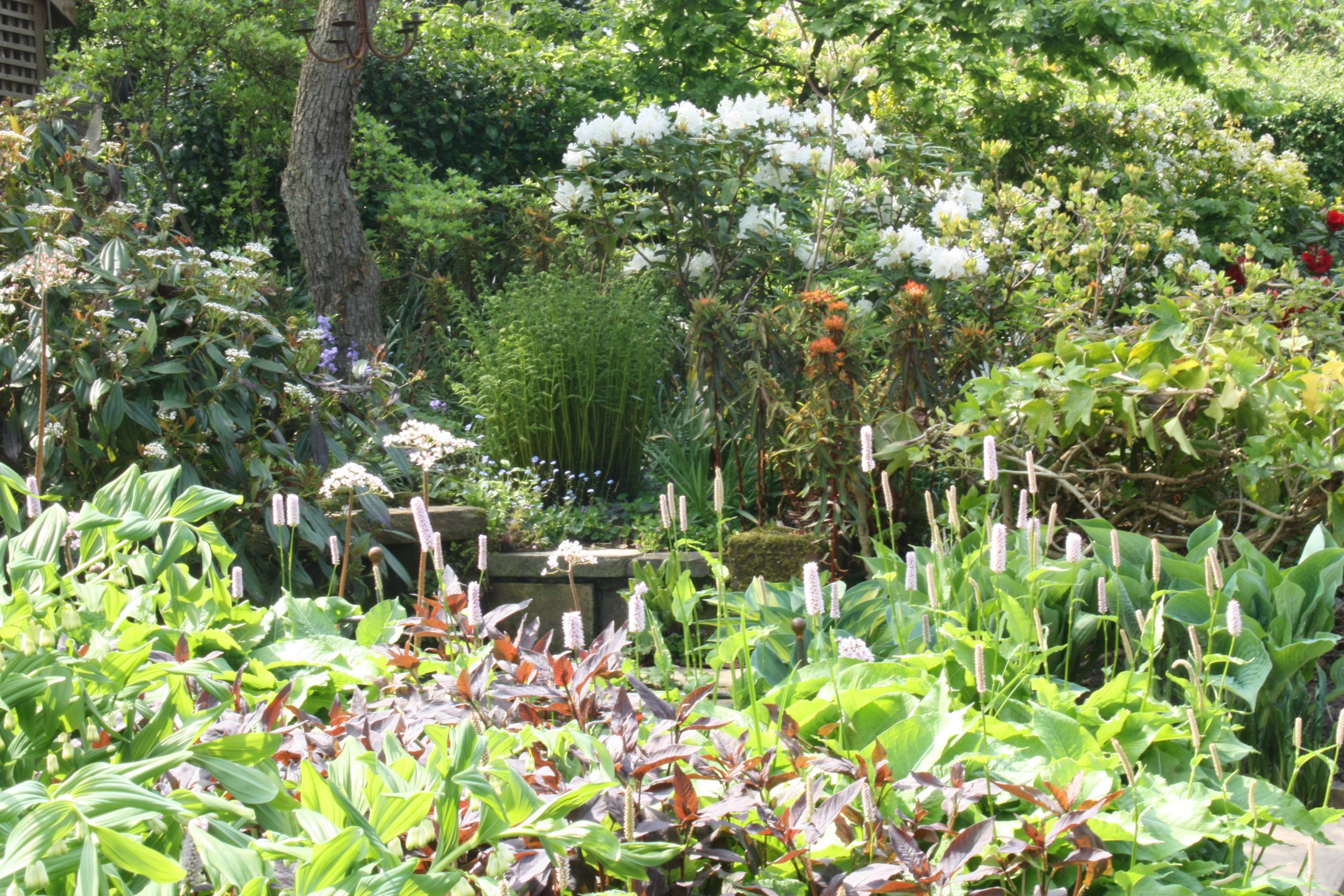 You cannot fail to fall for this peaceful, riverside garden situated on the Bridgewater towpath. Beautifully structured, this ¼ acre south facing garden is carefully terraced with a hazel arch opening to a clay paved courtyard with peach trees. Rose pillars lead to herbaceous beds and there are quiet shaded areas bordered by fuchsias, azaleas and rhododendrons. Owners, Mike and Gail Porter, invite you in…