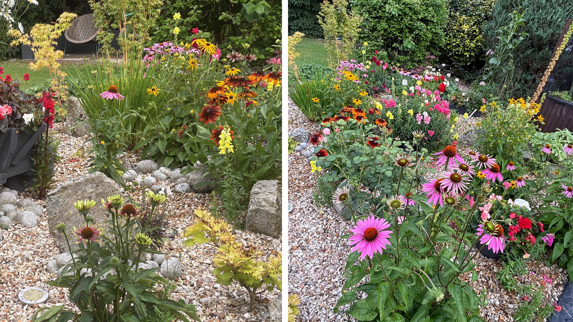 So it’s little surprise to find that Keith’s garden, which he shares with his wife Rhian, is bursting with colour. The front garden is pretty unassuming but the back garden – which borders a nature reserve – is packed with colour. Echinacea, snap dragons and rubekia sing out from the beds and provide a really sunny welcome, and there are also seating areas to rest and soak in the atmosphere.