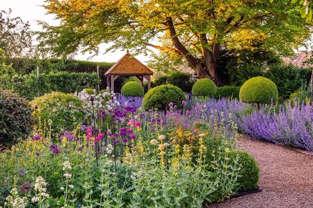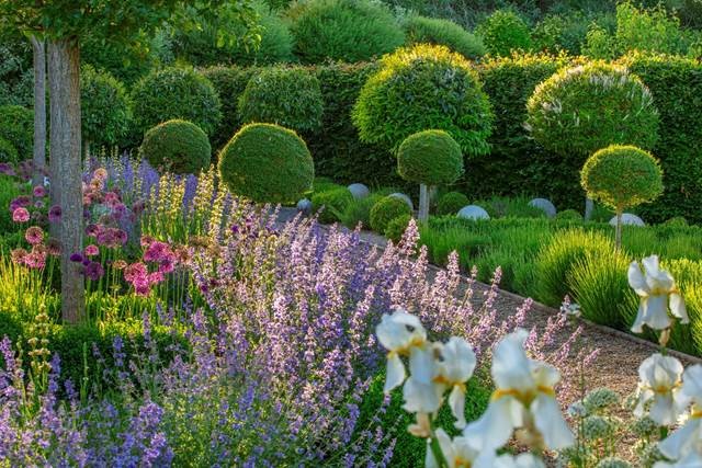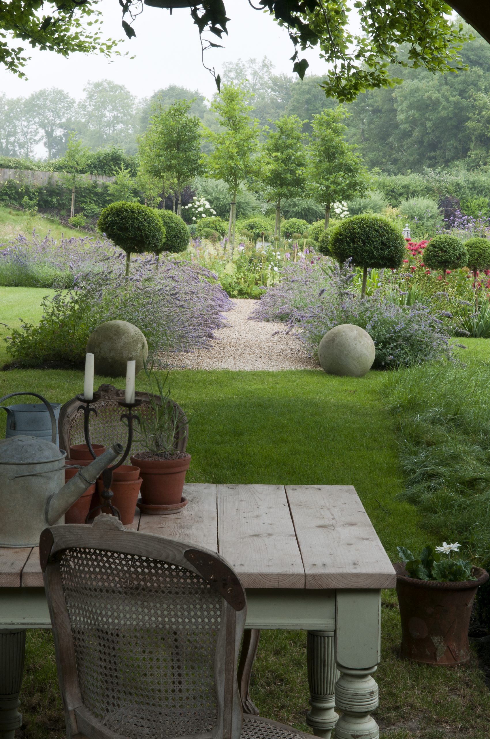 - Look thought the Orchard house along the garden path edged with Nepeta ‘Six Hills Giant’ and Privet – Legustrum – Lollipops.