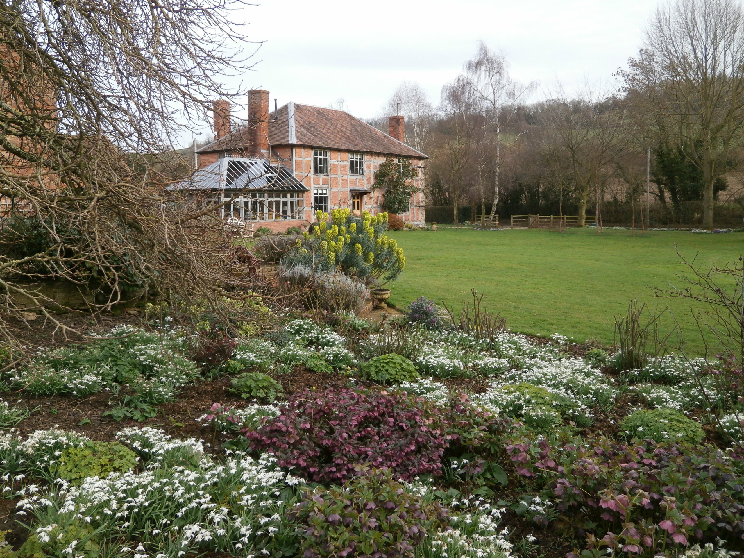 Coddington Vineyard in Herefordshire is five acres including a two acre vineyard, listed farmhouse, and cider mill. The garden has terraces, woodland with massed spring bulbs, a large pond with stream garden, masses of primula and Hellebores and snowdrops, Hamamelis and Parottia. Home-made teas and apple juice available!