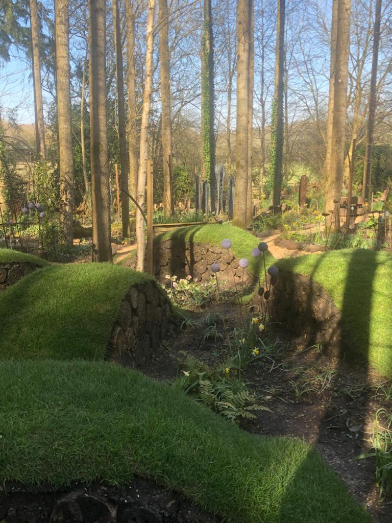 - The sloping lawn leading down to the woodland