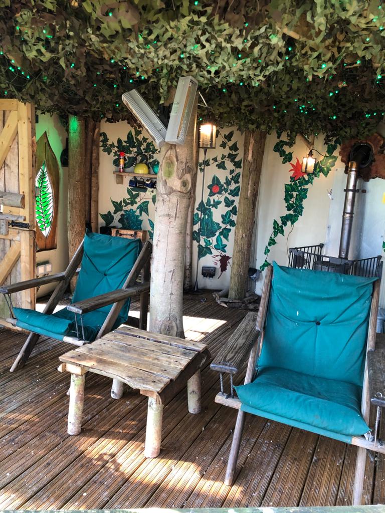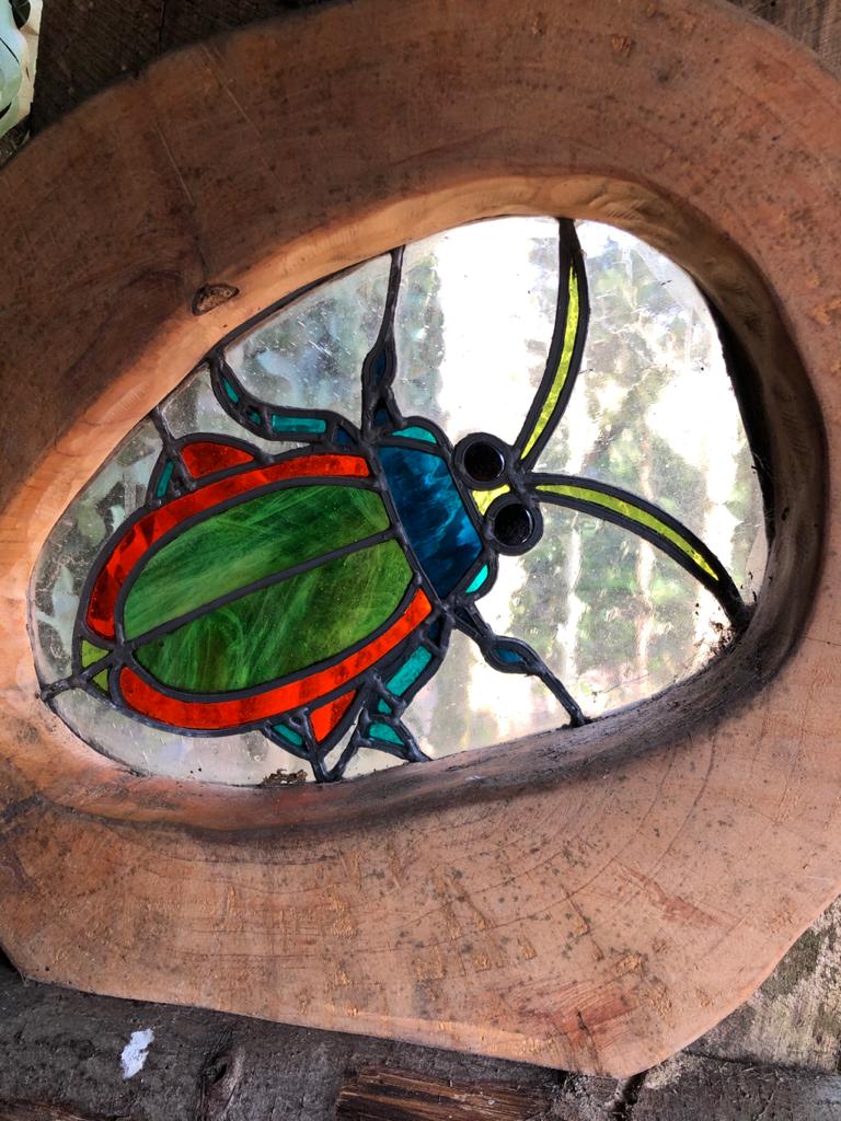 With the building complete the family started having fun; in went a wood burning stove, comfy chairs, and gorgeous stained glass bug windows that throw sun dappled colour across the walls and floor.