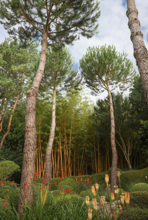 To achieve his aim, the garden is not designed in the orthodox way. Geoffrey has built on his love of architectural plants, shape and form, influenced by Japanese gardens but not copied. There are pine trees and bamboo, topiary and cloud forms in every shade of green. The result is a calm, reflective space, that uses the light to play through the vertical planting as the day progresses and the seasons turn. It’s a garden for contemplation and immersion and one that is always green.