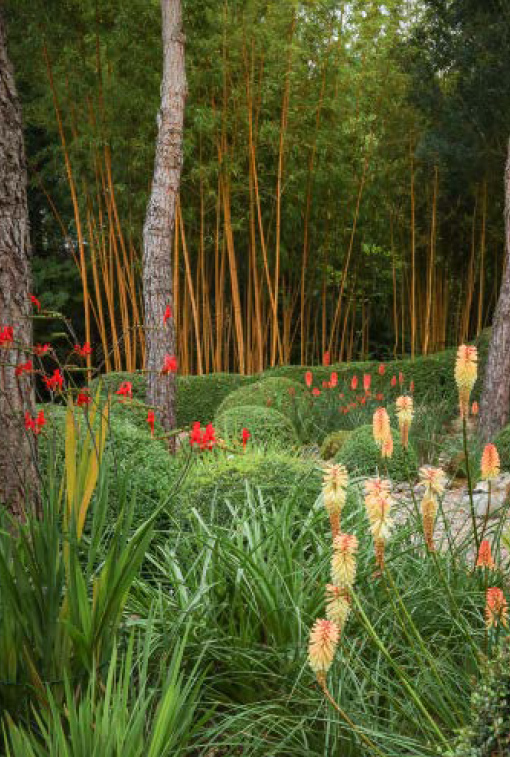 - A clump of Kniphofla ‘Tawny King’ with a stand of 7 metre tall Phyllostachys vivax aureocaulis bamboo
