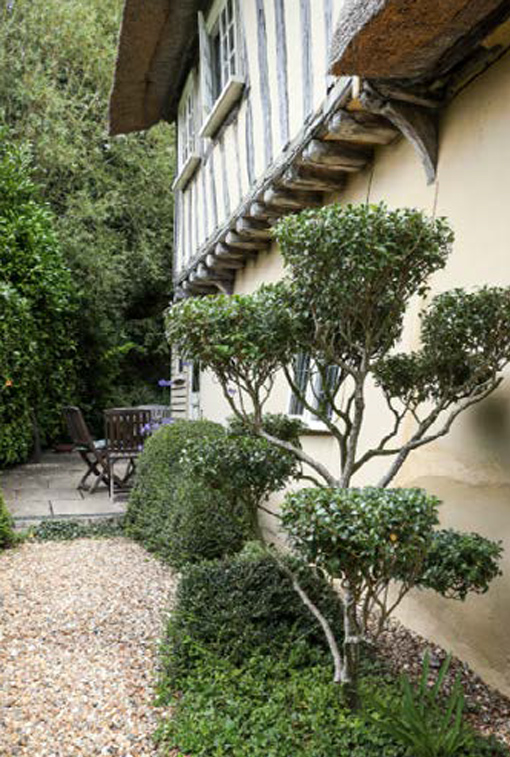 - Cloud-pruned Osmanthus burkwoodii at the front of the house