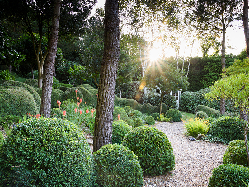 What Geoffrey has created is a very personal oasis of evergreen planting. Featured on the first episode of Gardeners’ World in 2022, Adam Frost describes the garden as “a considered study in texture, structure, form and space, with foliage from all around the world bought alive by winding gravel paths. It’s all about gardening in layers and contrasting the vertical with the horizontal. The trunks of the tall trees help frame the multi-stem shrubs that have had their canopies lifted and at their feet topiarized evergreen forms an undulating bank.”