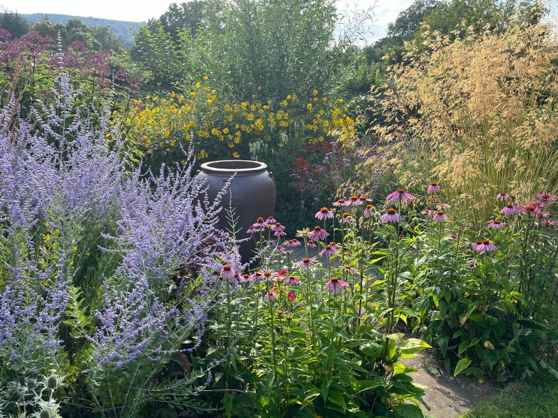 Bramble Croft in West Yorkshire is a small hidden hillside artist’s garden full of colour and texture and includes perennials, ferns, climbers, grasses and sculptures, and lies on the edge of Silsden village. Wildlife is encouraged with ponds, bird and insect boxes. There are also original paintings on show and for sale in the new tranquil garden room. Visit on Sunday 7 September or By Arrangement. Click here for details