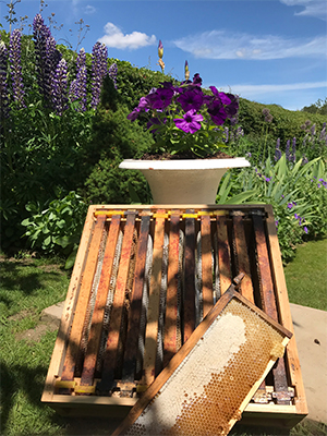 There will be a spring honey crop after all, I have taken a break from extracting to write this June blog. What a roller coaster of a year 2021 has been so far. Five weeks of freezing drought was followed by an end of May deluge of cold rain. Spring never really happened; amazingly the sun finally came out on the 26th May right at the very end of the season. But what a difference the little bit of warmth made; the garden leapt out of the ground and the bees literally exploded out of their hives. Three swarms in three days at the end of May.
