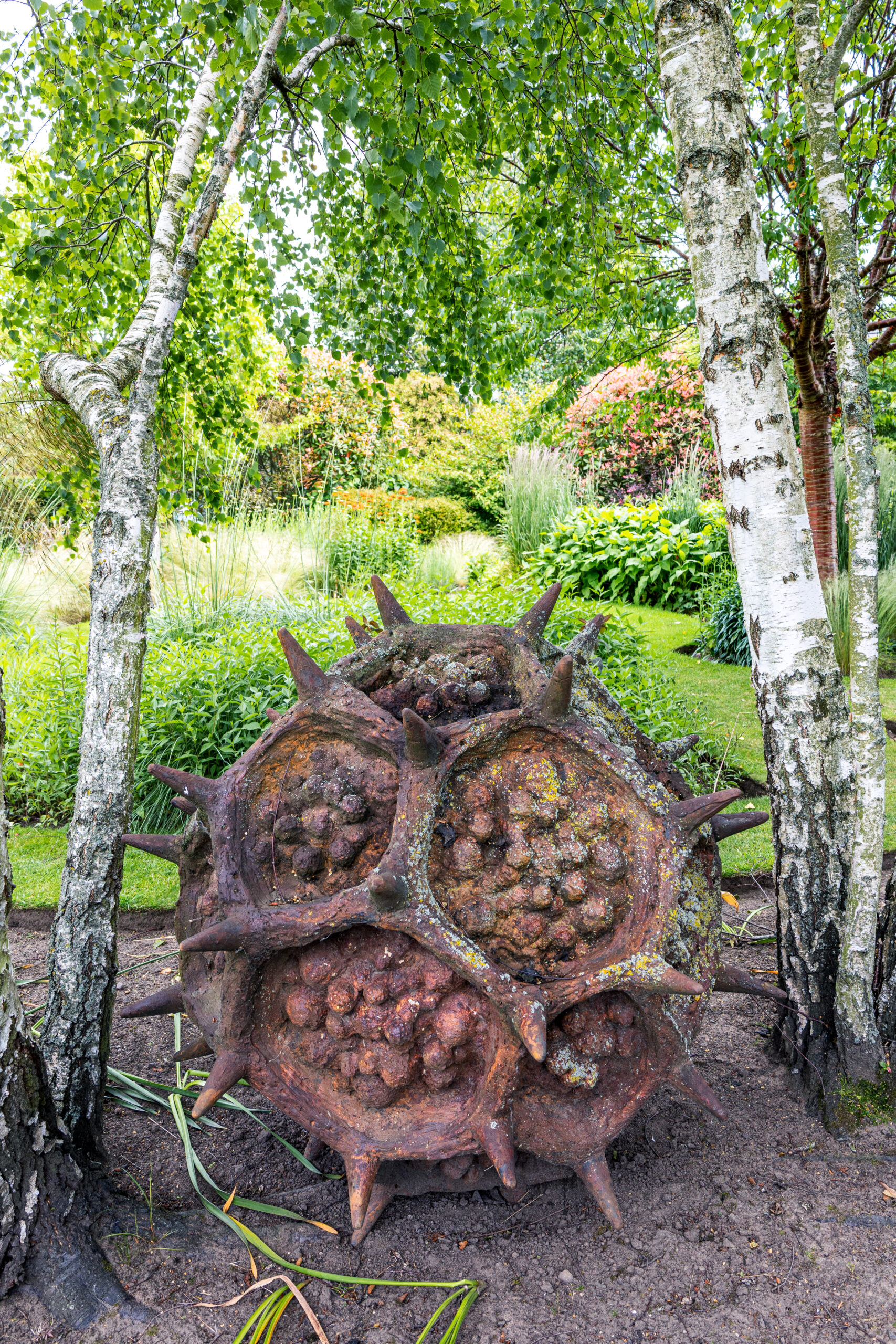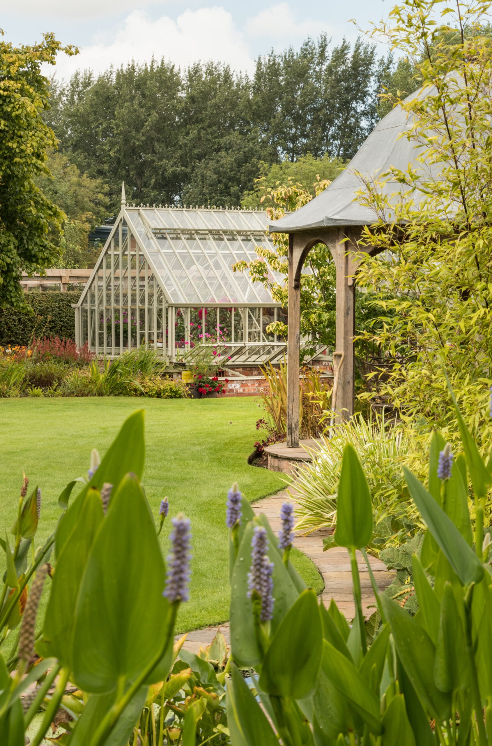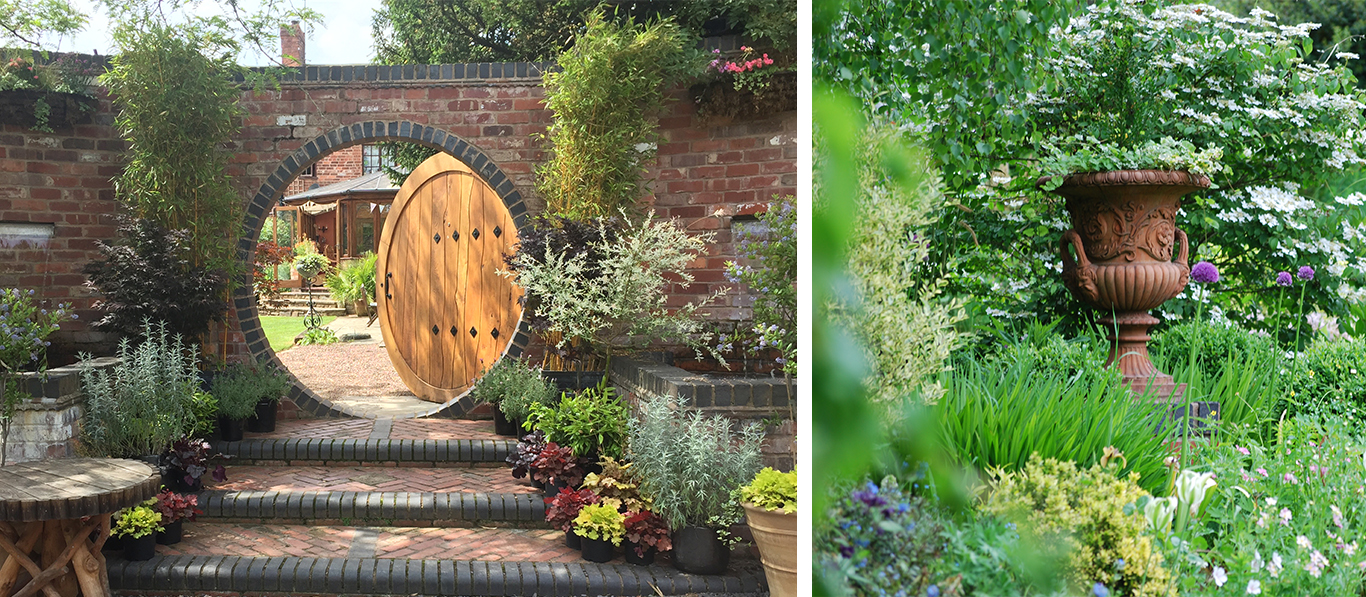 Three acre show garden of professional garden designer includes a large variety of trees and shrubs. Features include a twisted brick pillar pergola, 2½ metre diameter solid oak moongate set into reclaimed brickwork, and a four turreted, mini moated castle folly with vertical wall planter set between two water falls, then walk through giant gunnera leaves into the Fairy Garden.