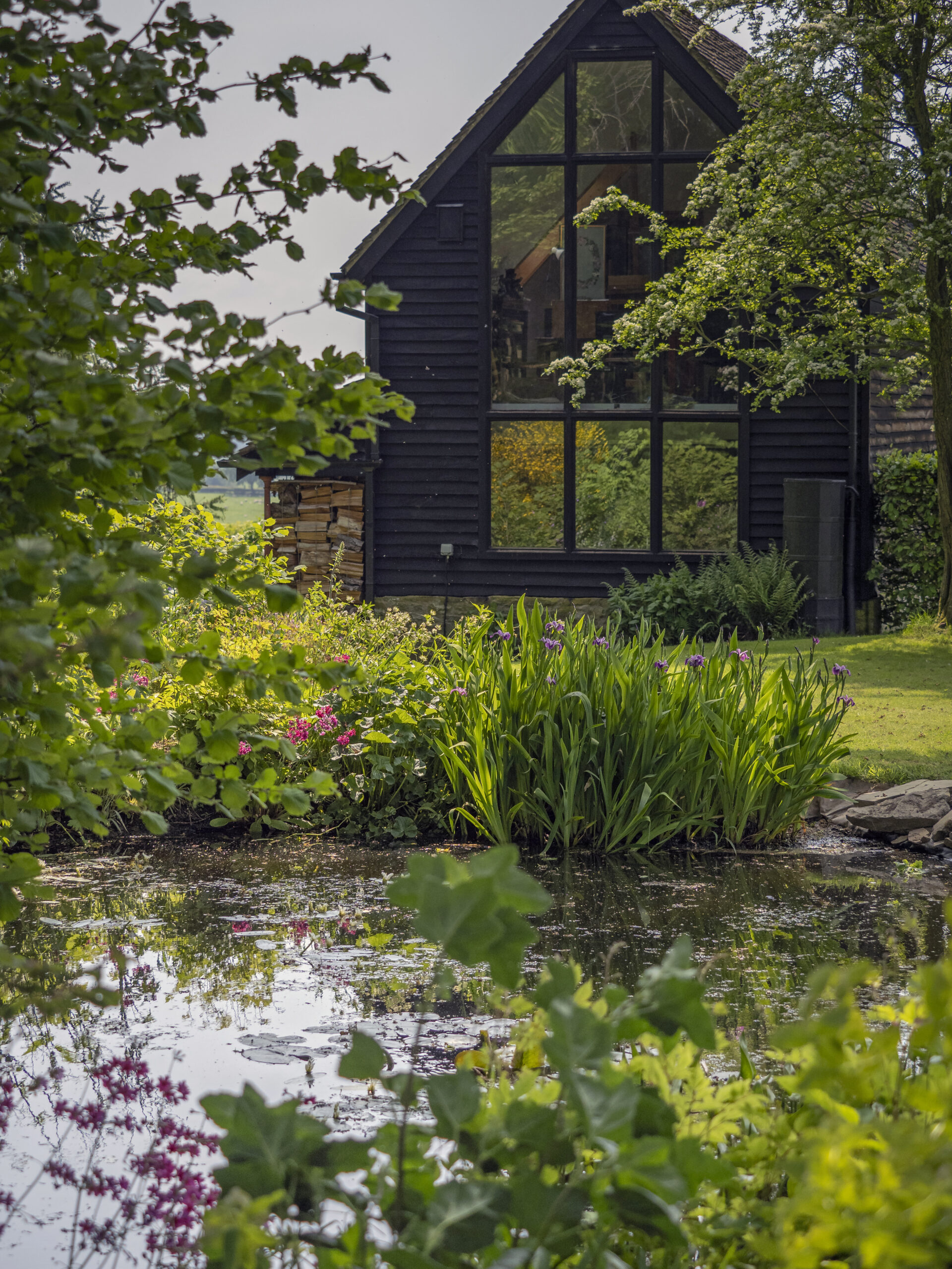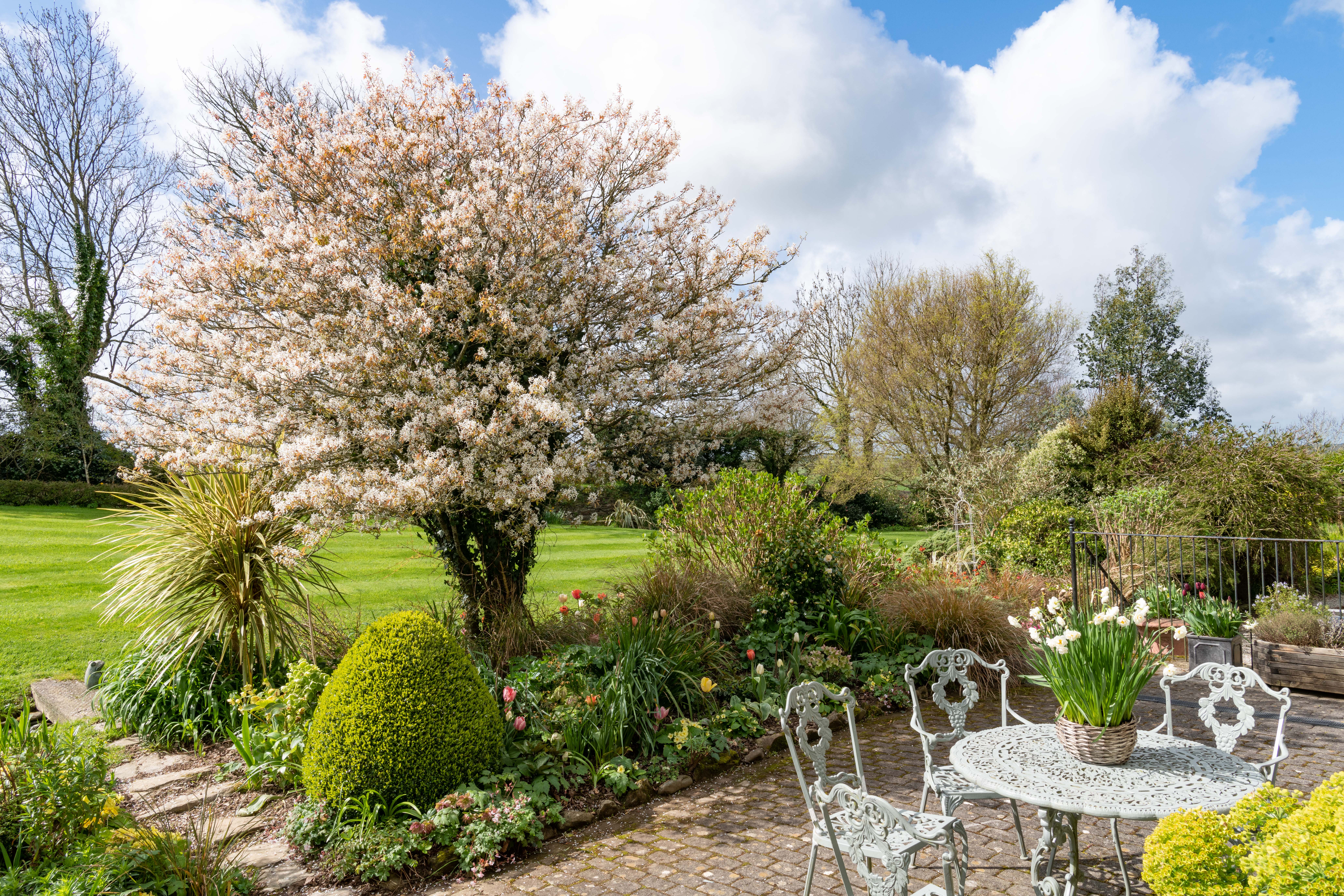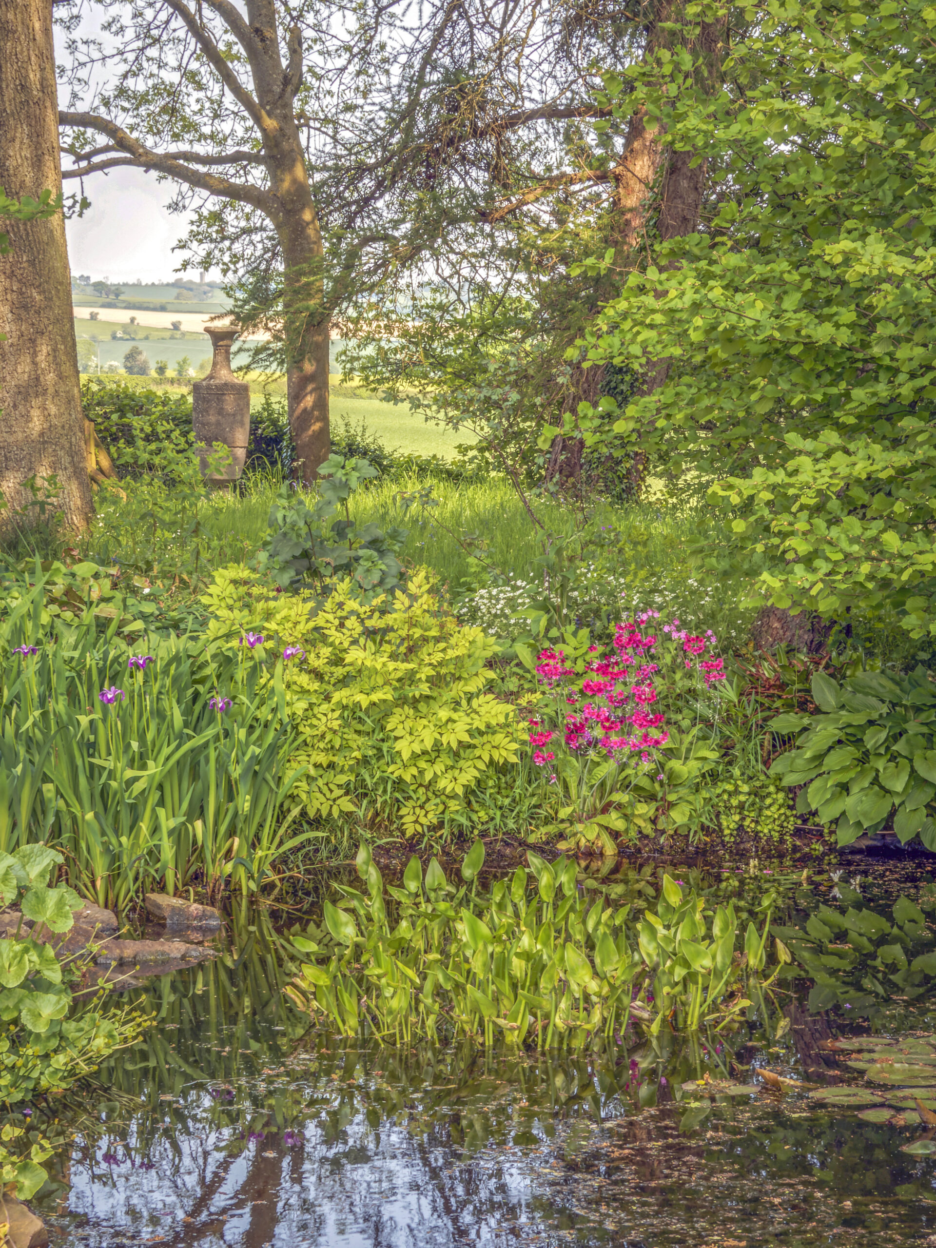 Bush House, set in eight acres, over 13 years, a two acre garden has emerged. Herbaceous borders partner dual level ponds and stream. The terrace leads to a walled parterre framed by roses and wisteria. The ‘wildflower meadow’ (sown 2021) orchard is screened by rose and vine covered wrought iron trellis. Kitchen gardens, greenhouses and fruit cage provide organically grown produce. Click for details