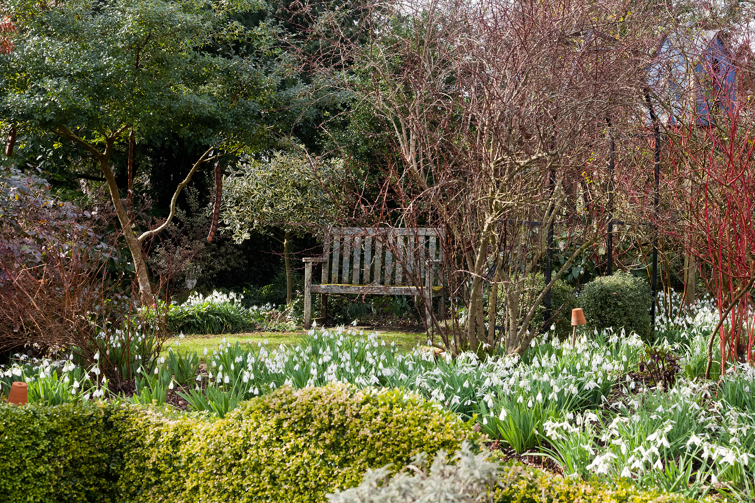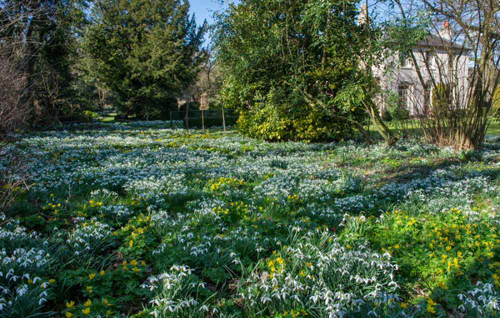 Bolham Manor, Nottinghamshire. This three acre mature garden provides year-round interest. In February, swathes of snowdrops greet you, followed by daffodils and other spring bulbs. Topiary features and sculptures guide you through the different areas of the garden, with its mixed planted terraces and herbaceous borders, ponds, orchard and wildflower areas. Click for details