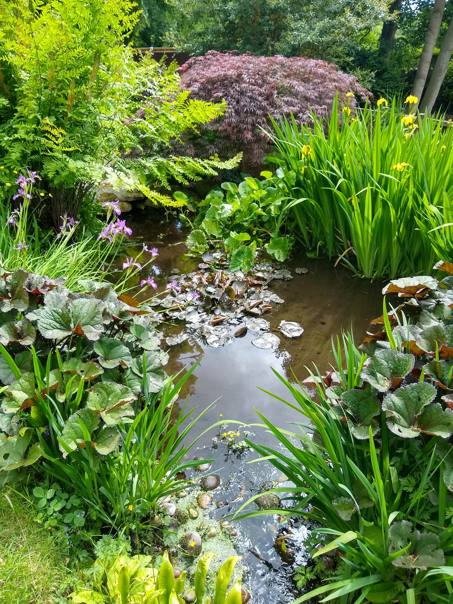 Hamilton House, Staffordshire. A ½ acre north-facing English woodland garden in a tranquil setting, making the most of challenging shade, providing a haven for birds and other wildlife. Large pond with a stone bridge, pergolas, water features, box garden with a variety of roses. Interesting collection of rhododendrons, clematis, hostas, ferns, old English roses and stunning artworks in the garden. Click for details