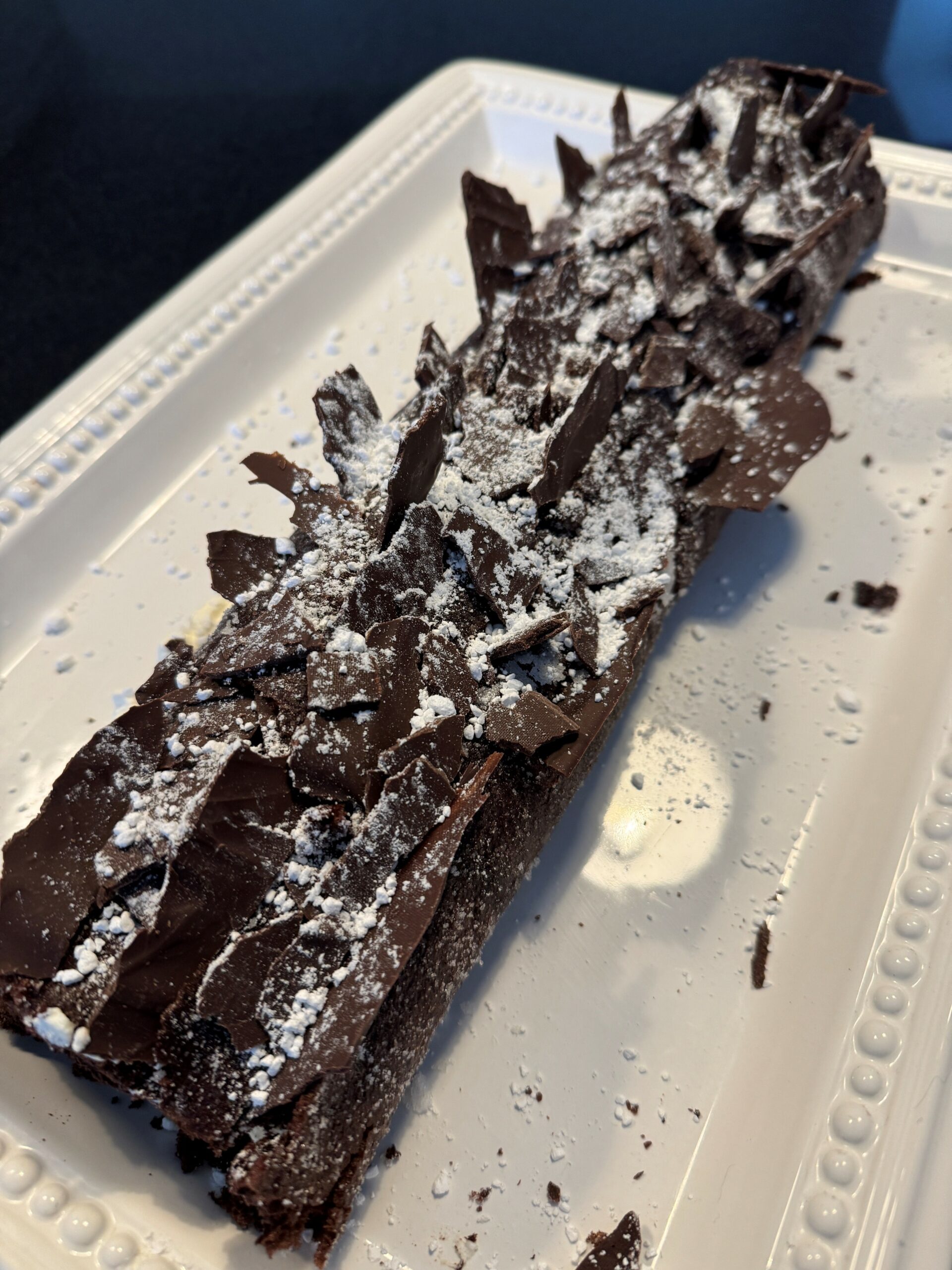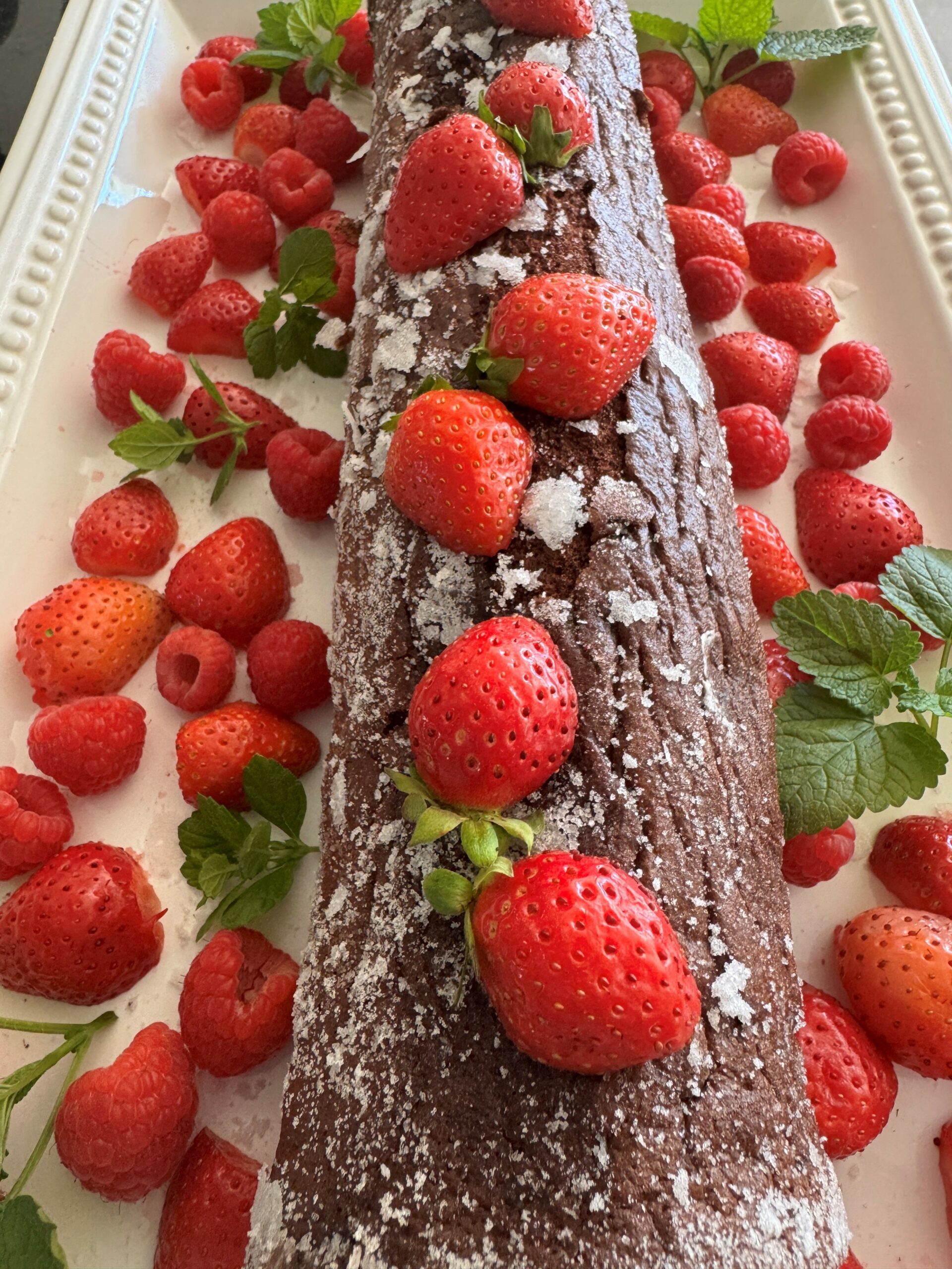 - When the cake is cold, unroll it and remove the paper. Spread with the whipped cream and re-roll it to form the ‘log’, dredge with icing sugar and decorate. You can add chopped strawberries or cherries and kirsch or fruit jam with the cream or any seasonal combination.