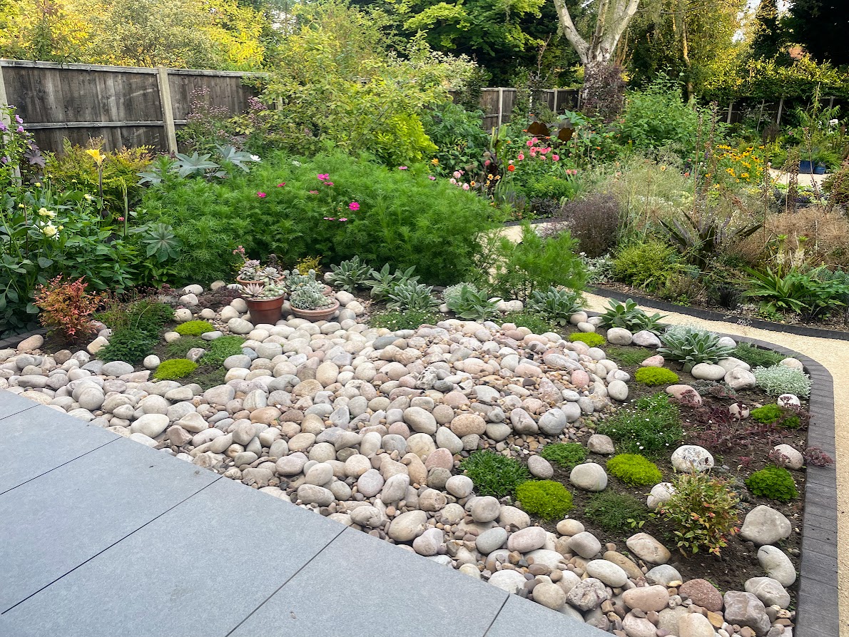 It is drought tolerant once established (Delospermas, Erigeron karvinskianus, Stachys, Thymus, Nandina domestica smaller cultivars, bulbs – crocuses in spring, colchicums in autumn amongst others) and as it sits on top of the rainwater harvesting tank, there is a small water feature with gravel/pebbles to mark the area. This however is not directly connected or fed from the tank below but is topped up from the tank as and when needed.