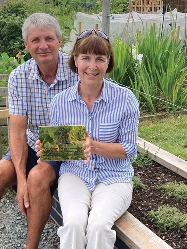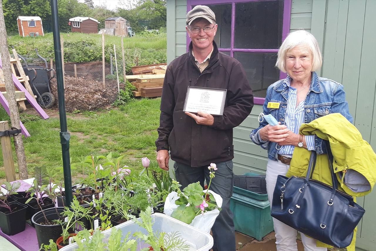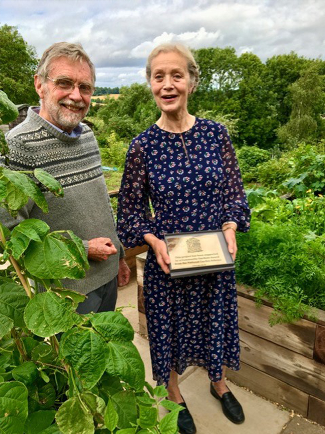 - John and Belinda Howarth accept the plaque for the Bowbrook Allotment Community, Shropshire, growing fruit and vegetables organically and in harmony with nature