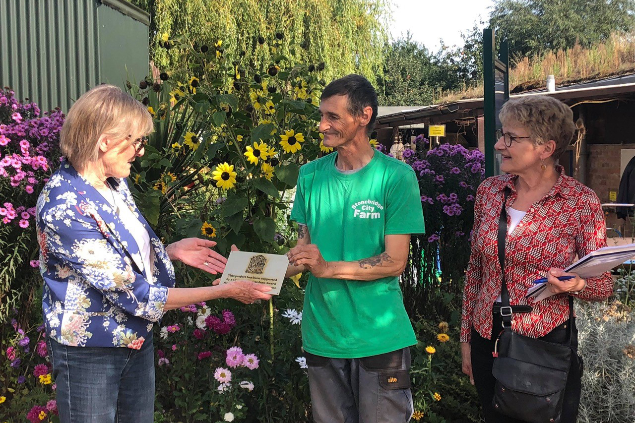 - County Organiser for Berkshire, Heather Skinner presents the National Garden Scheme Community Gardens Award plaque to the New Leaf Project – an allotment project which uses gardening to help local people with mental health