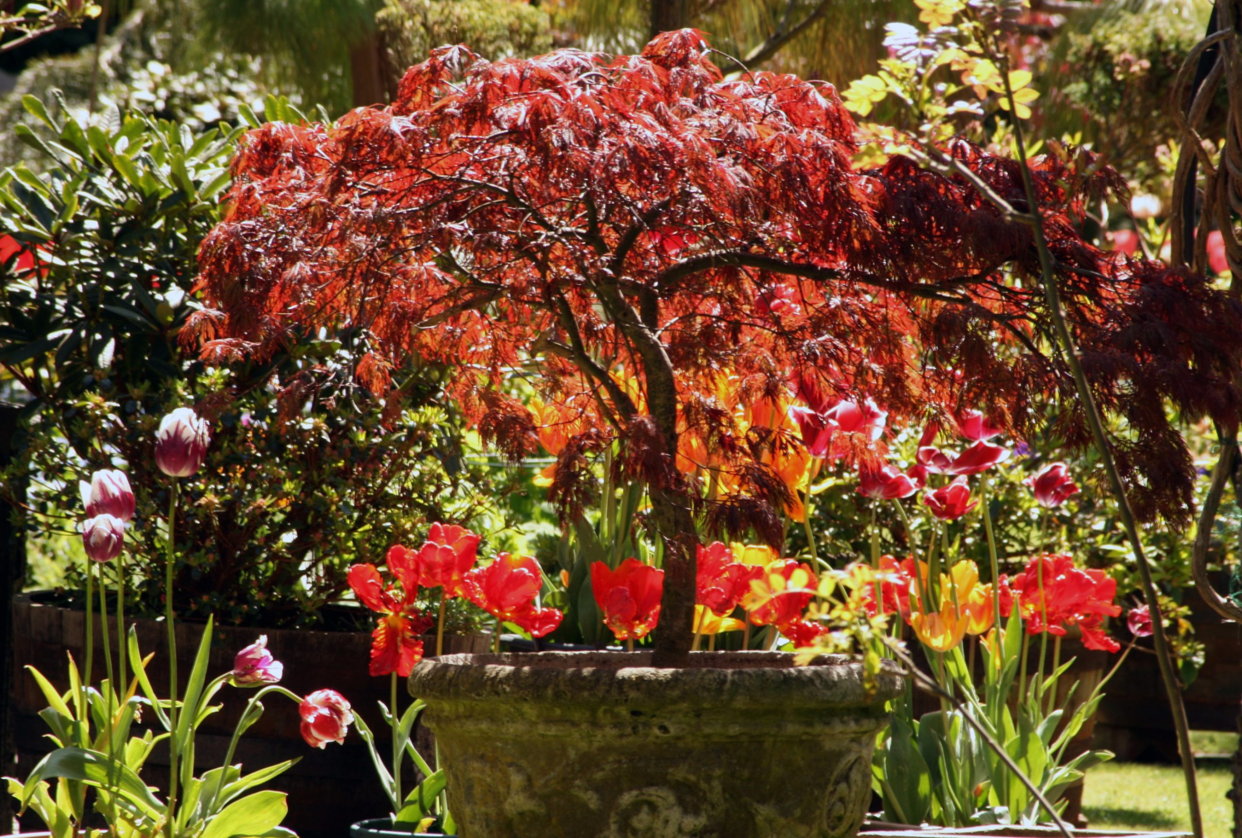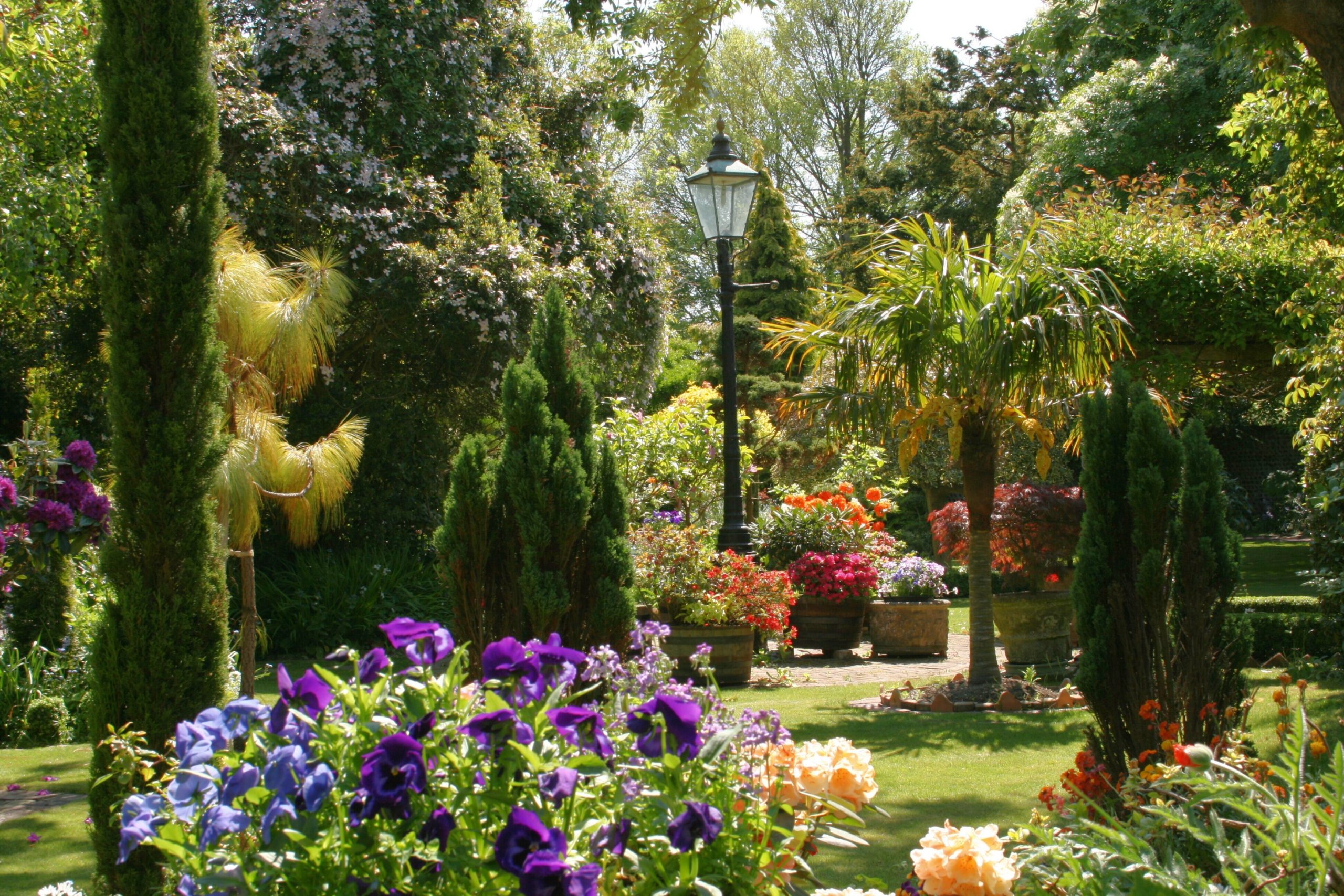The garden is ablaze with fantastic colours. Wendy uses a variety of blue and purple pansies in urns from November to spring, and then begonias and geraniums from spring round to the autumn. When visitors ask how the garden is maintained, Wendy reveals the secret is just 20 minutes of deadheading a day, and the garden looks wonderful.