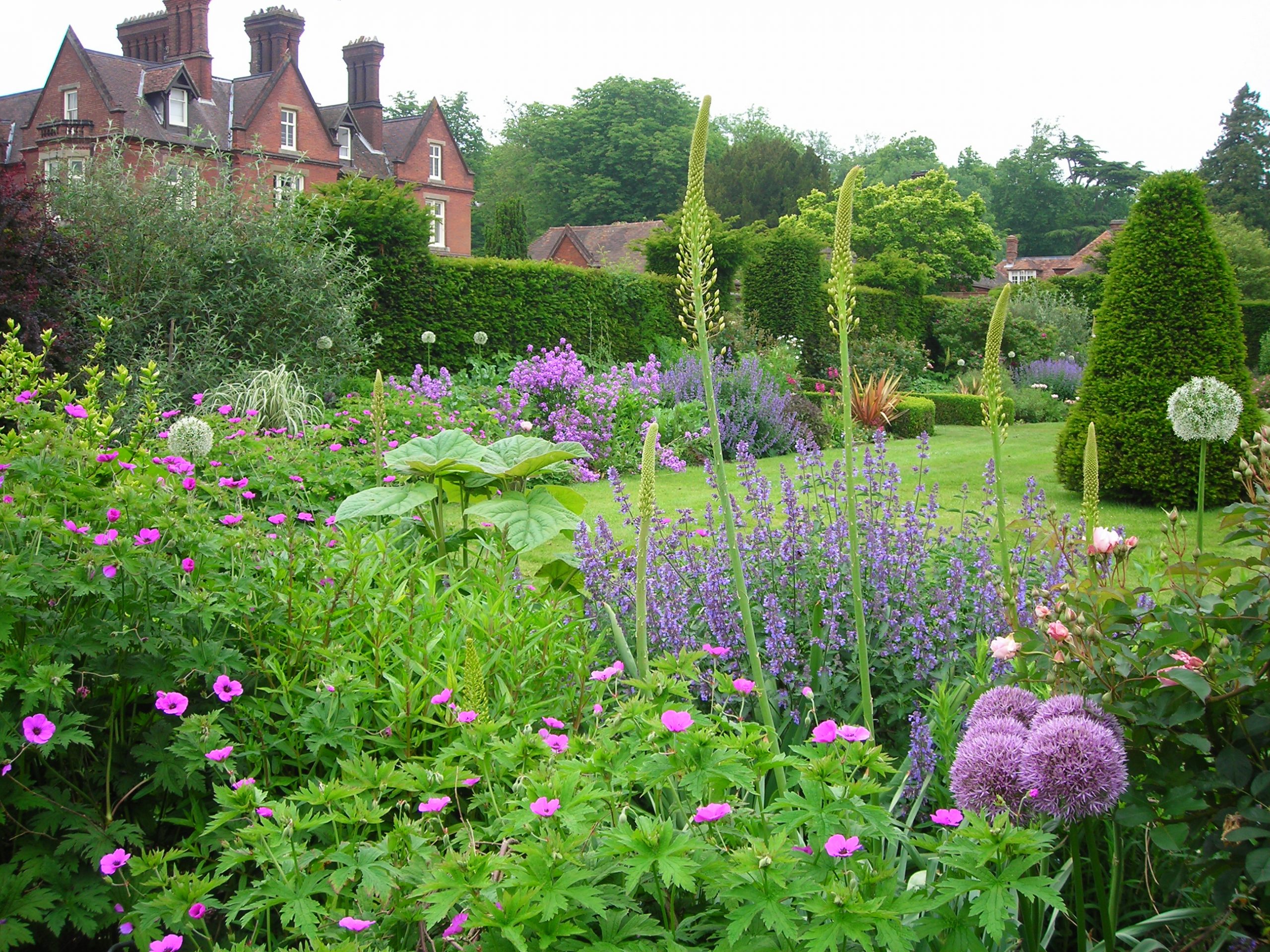 Perched on an eminence in the North Downs area of outstanding natural beauty, with panoramic views over the surrounding countryside, the garden is a voyage of discovery: yew hedges of a truly fantastical size frame some areas and with paths leading away from the garden around the Victorian house to the woodland garden, the folly walk and the marvellously authentic rock garden that was painstakingly restored in the early 2000’s. In midsummer the woodland garden is cool and shady with many choice flowering trees and shrubs and you will also come to the magnificent Wellingtonia Walk, where the trees were planted in the mid-19th century, shortly after their first introduction to Britain from western United States.