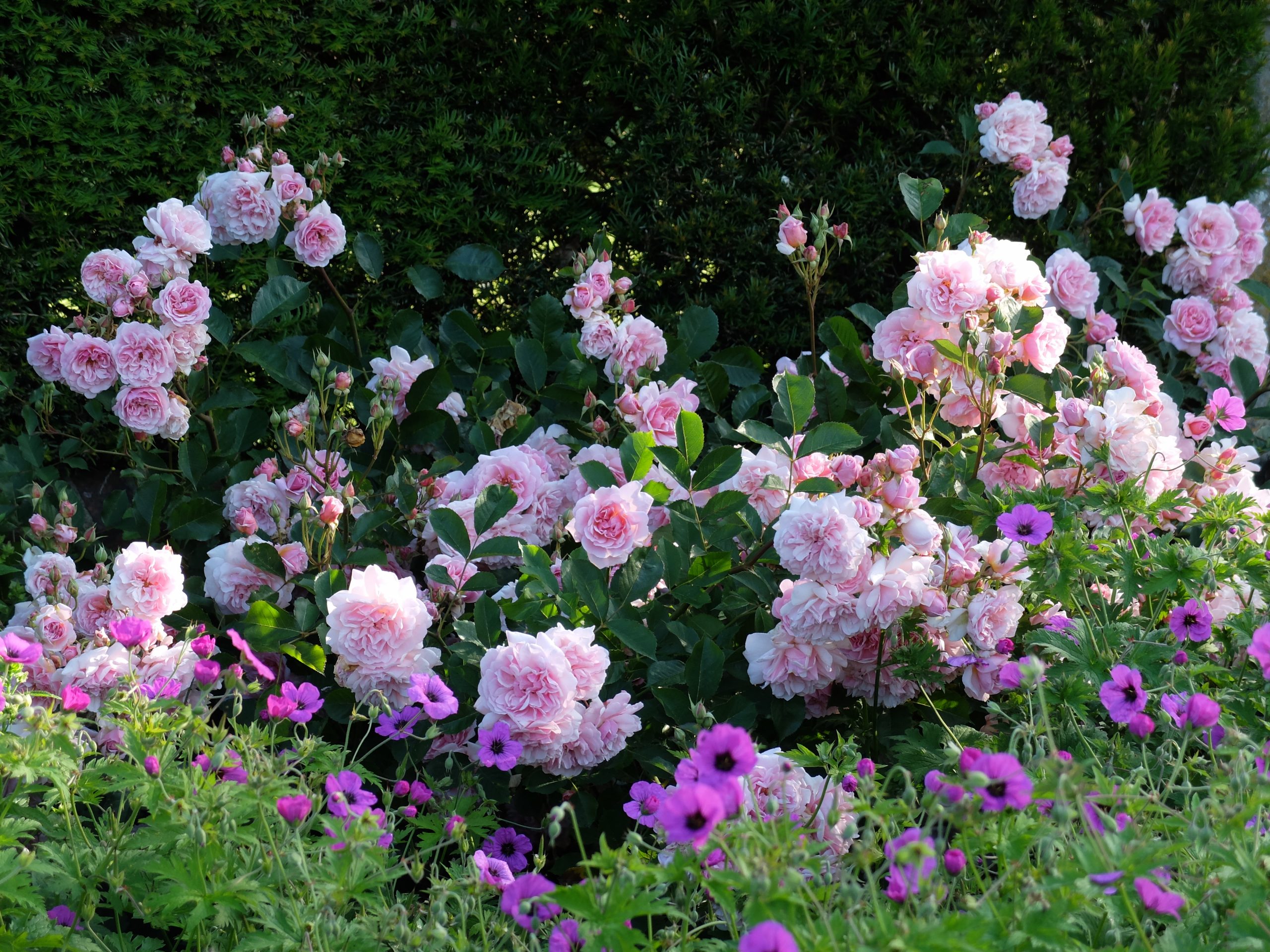 Close to the house flower borders and the sunken garden are brimming with annuals, perennials, shrub and climbing roses, while the beds around the sunken garden’s central pool are a pure white sea of Cosmos ‘Purity’. At this time of year it provides a picture of quintessential country garden planting, full of lively and adventurous touches but blending softly into the garden’s older framework of low walls, balustraded terraces and yew hedges.