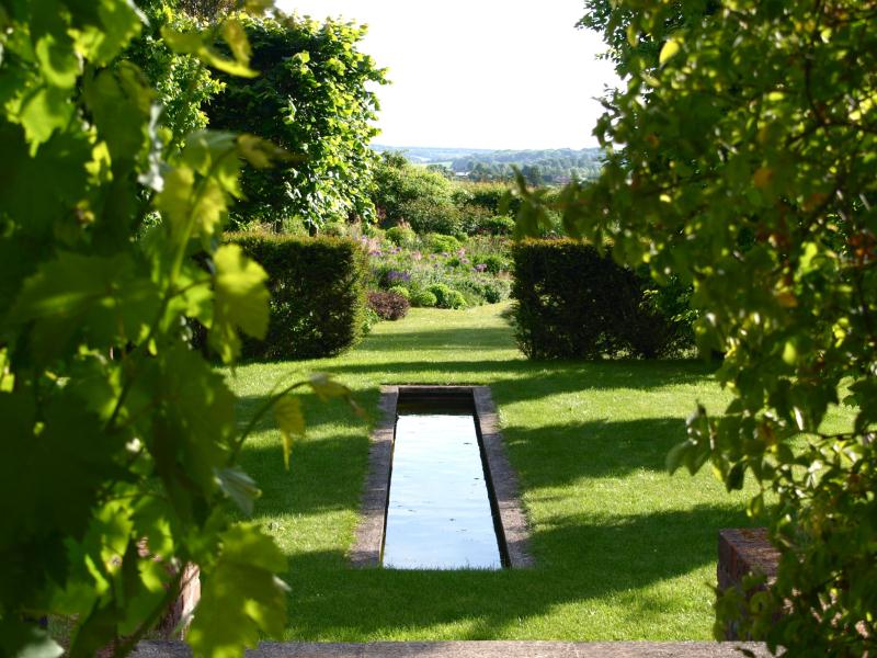 The Old Vicarage, West Sussex, offers a wonderful three and half acres to explore including a front garden of topiary, wide lawns, mixed borders and a contemporary water sculpture. The rear features new and mature trees herbaceous borders, a water garden and stunning uninterrupted views of the North Downs. The Japanese garden with waterfall and pond leads to a large copse, stream, treehouse and stumpery. Perfect to engage children and adults alike.