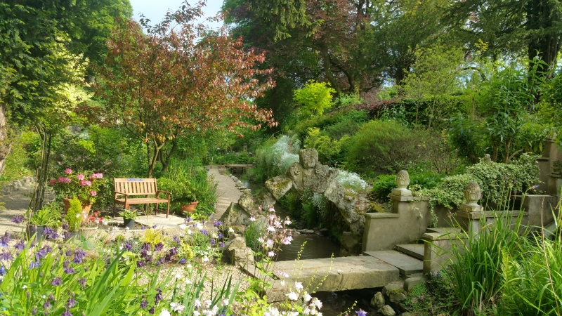 Cascades Garden, Matlock, Derbyshire. The Meditation Garden and Bonsai centre with its fascinating four acre peaceful garden in spectacular natural surroundings with woodland, cliffs, stream, pond and an old limestone quarry. Inspired by Japanese gardens and Buddhist philosophy, there are secluded garden rooms for relaxation and reflection. Beautiful landscape with a wide collection of unusual perennials, conifers, shrubs and trees.