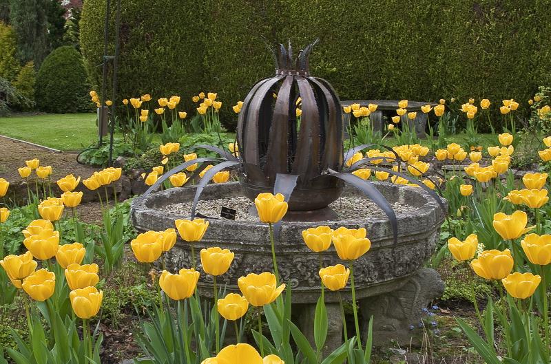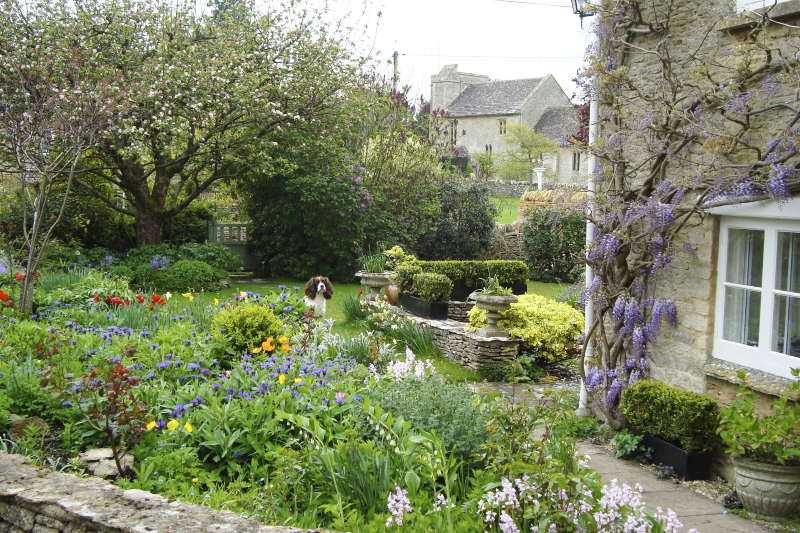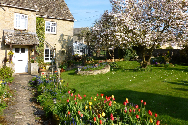 Trench Hill, Gloucestershire is a garden of three acres set in a small woodland with panoramic views. With a variety of herbaceous and mixed borders, rose garden, tulips, extensive vegetable plots, wildflower areas, plantings of spring bulbs with thousands of snowdrops and hellebores, woodland walk, two small ponds, waterfall and larger conservation pond. There’s plenty to delight including interesting wooden sculptures.