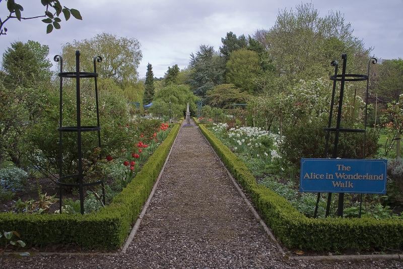 Poulton Hall, Cheshire. A quirky garden which children love. Three acres with lawns fronting the house and a wildflower meadow. Surprise approach to walled garden, with reminders of Roger Lancelyn Green’s retellings, Excalibur, Robin Hood and Jabberwock. Rose, nursery rhyme, witch, herb and oriental gardens and Memories Reading room.