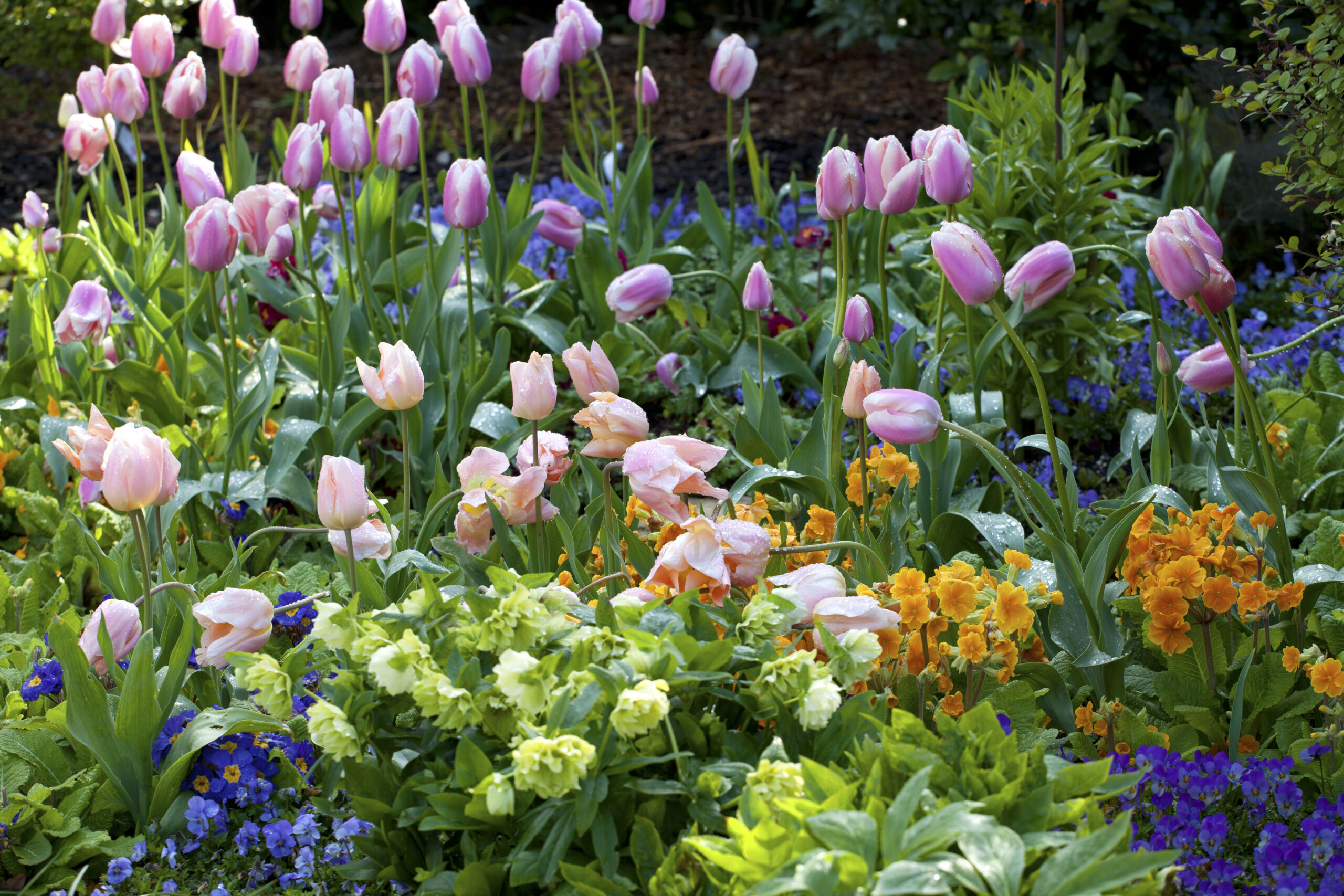 Ulting Wick, Essex Listed black barns provide the backdrop for vibrant and exuberant planting in eight acres. Snowdrops, narcissus, tulips, flowing innovative spring planting, herbaceous borders, pond, mature weeping willows, kitchen garden, wait to explored in April. Many plants propagated in-house with unusual plants for sale too.