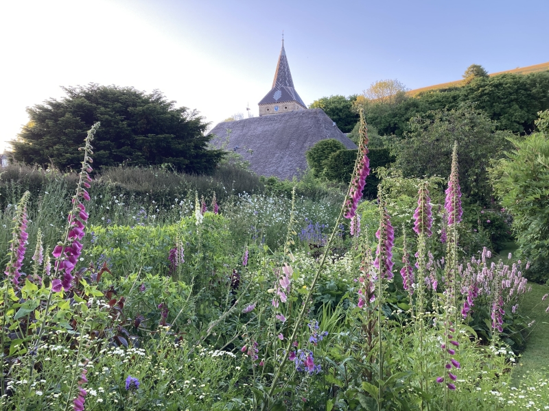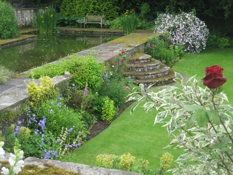 The Court House, in East Meon, Hampshire (pictured above) is a 2 acre garden, surrounding a medieval manor house (not open), laid out in the ‘Arts and Crafts’ style with separate areas divided by yew hedges and stone walls. The established herbaceous borders contain some unusual plants providing interest throughout the summer. Steps lead to a lower level with reflecting pool and progressively less formal planting. There’s also a 1 acre vineyard.