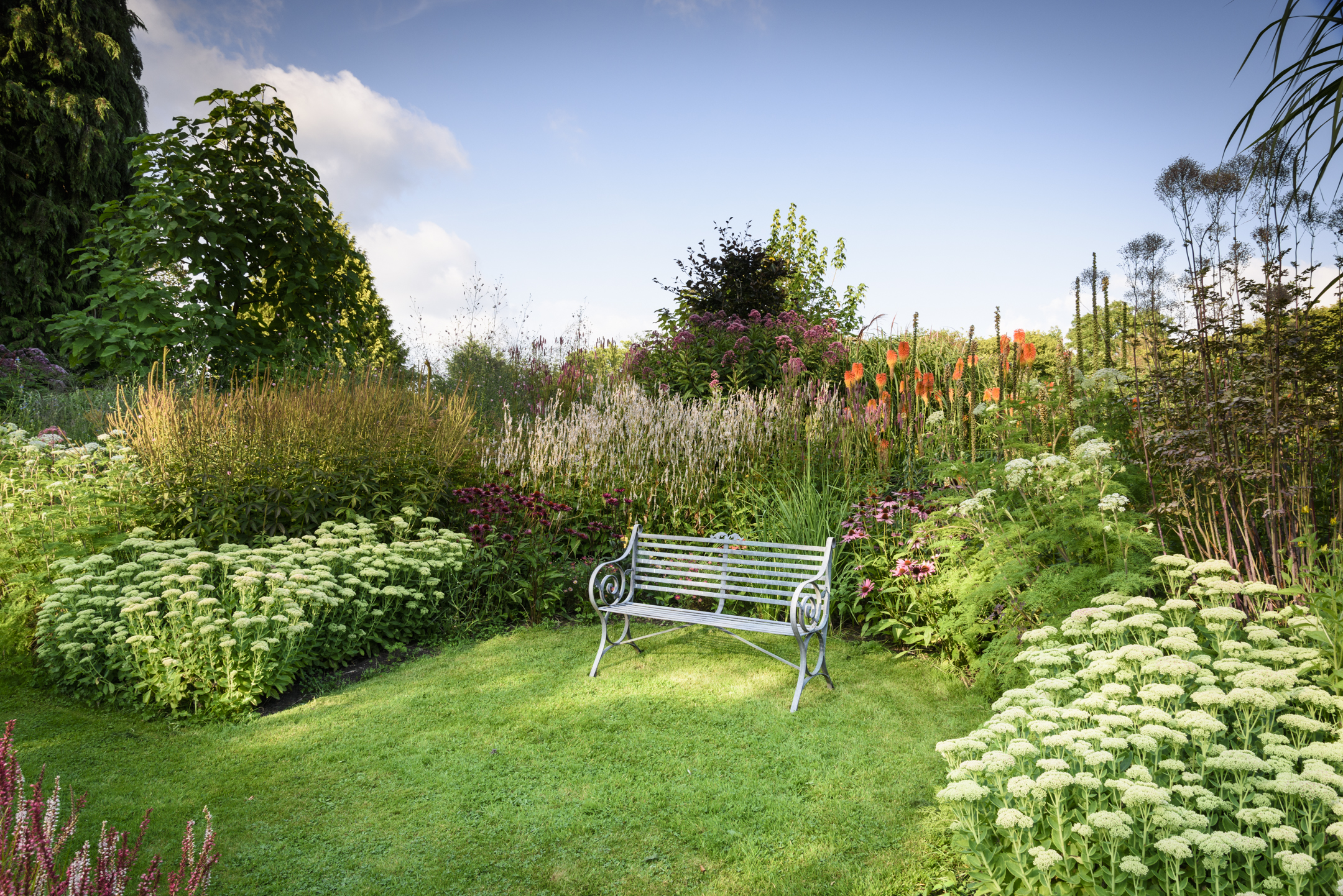 - Metal bench surrounded by herbaceous perennials at Highfields Farm in August including Hylotelephium spectabile, echinaceas, persicarias and kniphofias.