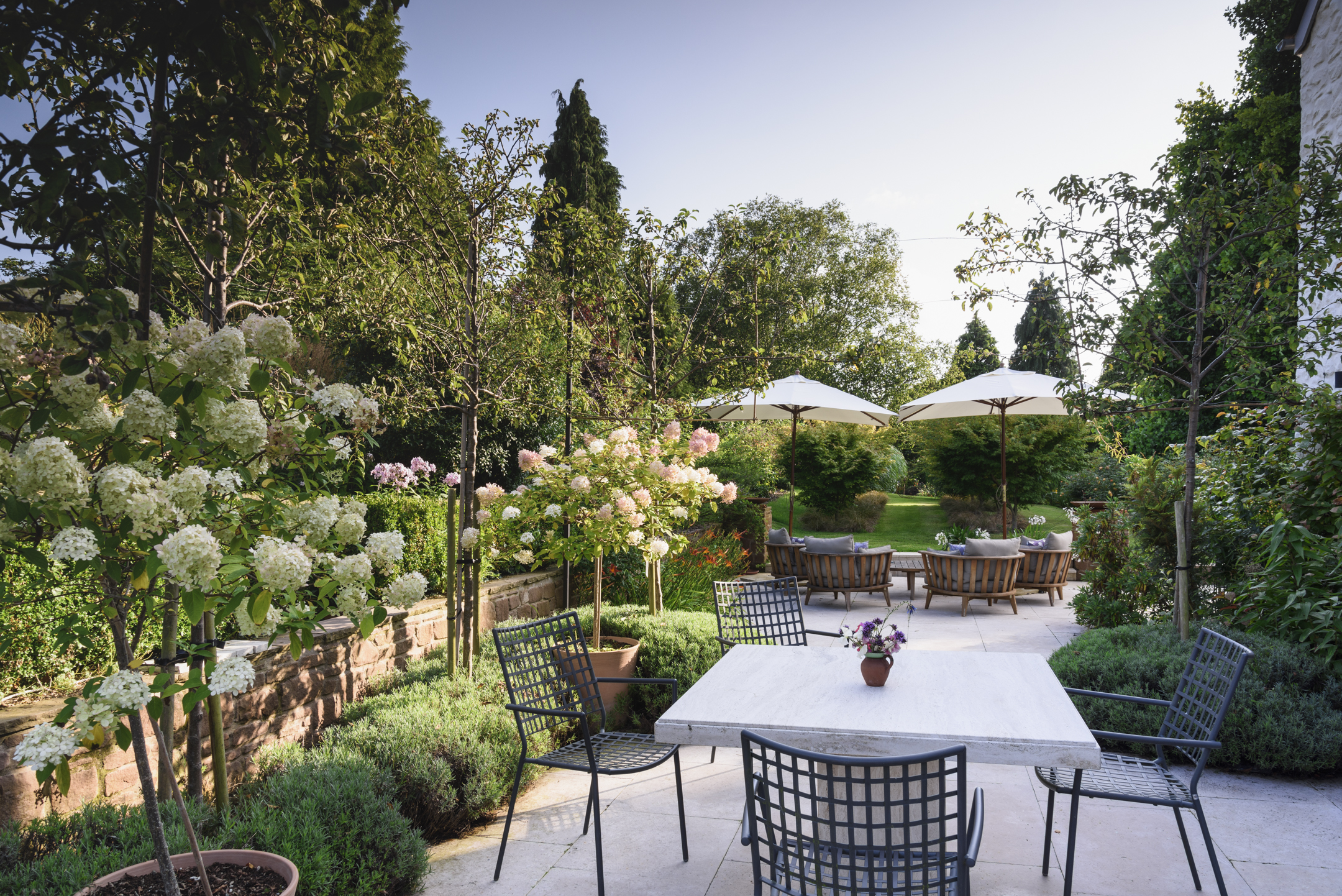 - Terrace with standard hydrangeas at Highfields Farm in August