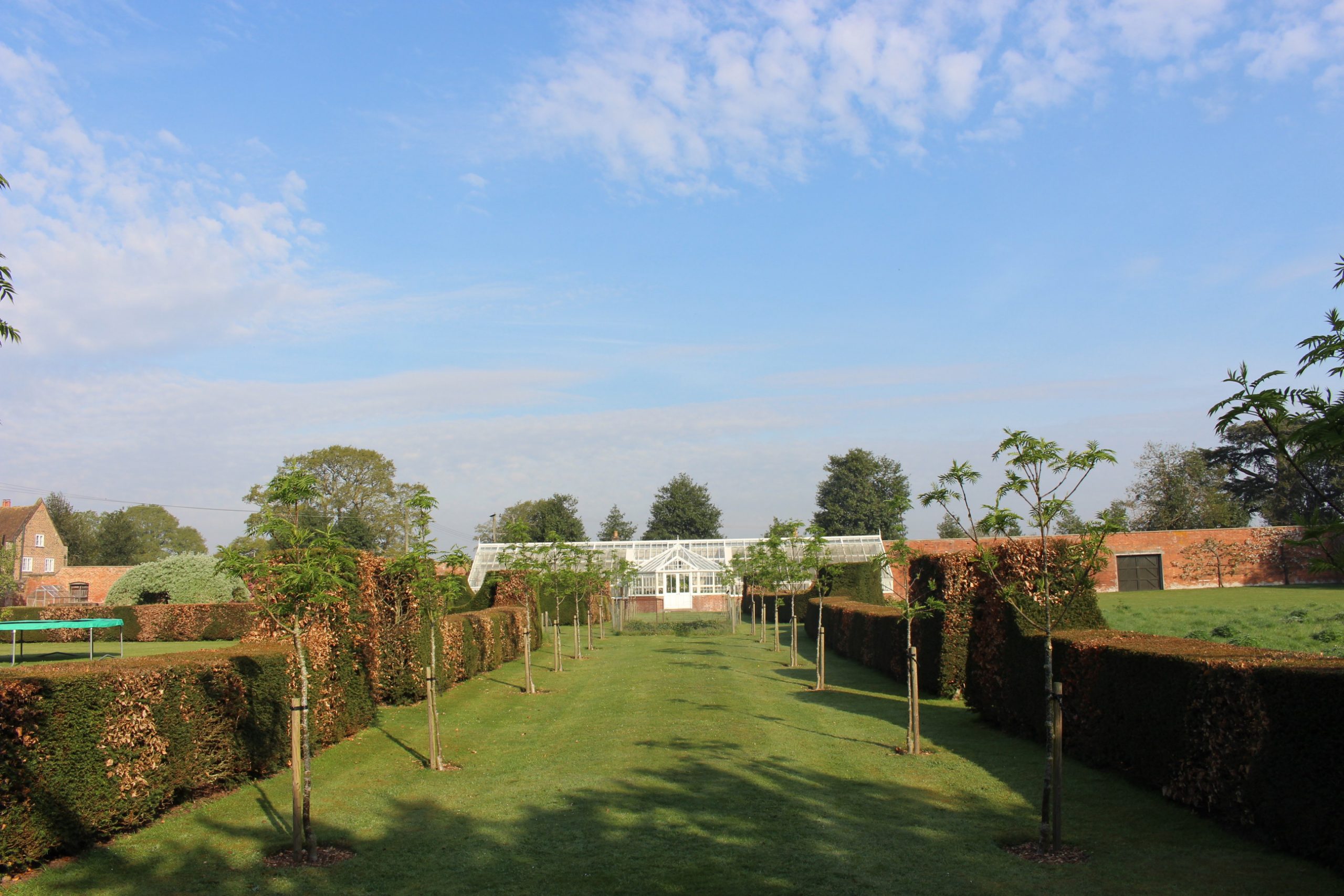 The Victorian walled garden covers about one hectare and is quartered by tapestry hedges. One of the quarters has been divided into 16 beds (loosely following the ‘Villandry’ model) and another section is wild and full of lupins. A variety of fruit trees and ancient apple trees still bear fruit and a topiaried box dragon lurks around a wall in one corner. The glasshouse, constructed by Foster and Pearson circa 1905, was extensively restored in 2000 although further repairs are still required. The garden was first opened for the National Garden Scheme by John and Julia Yorke, now his daughter and her husband have taken over while continuity is given by Alan Gregg, their gardener of 8½ years, who maintains the balance of history and present-day development.