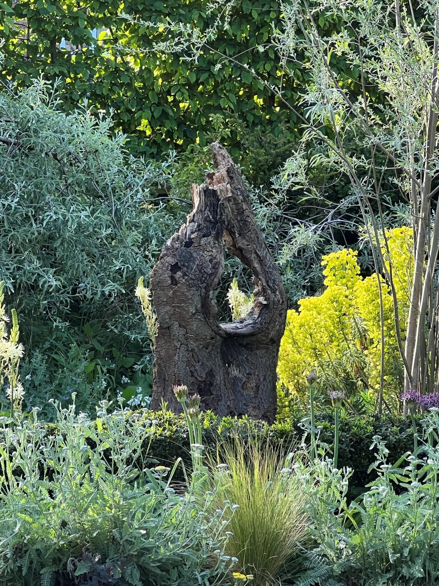 - Turning the corner, you emerge from the narrow darker space and walk into the light and enjoy the spaciousness of the lawn. Pause to breath deeply and take in the views of the garden, the ‘hug’ of the various layers and heights of the borders, the trees and the skyline behind. Feel the sun on your face (hopefully). Feel your body start to relax.