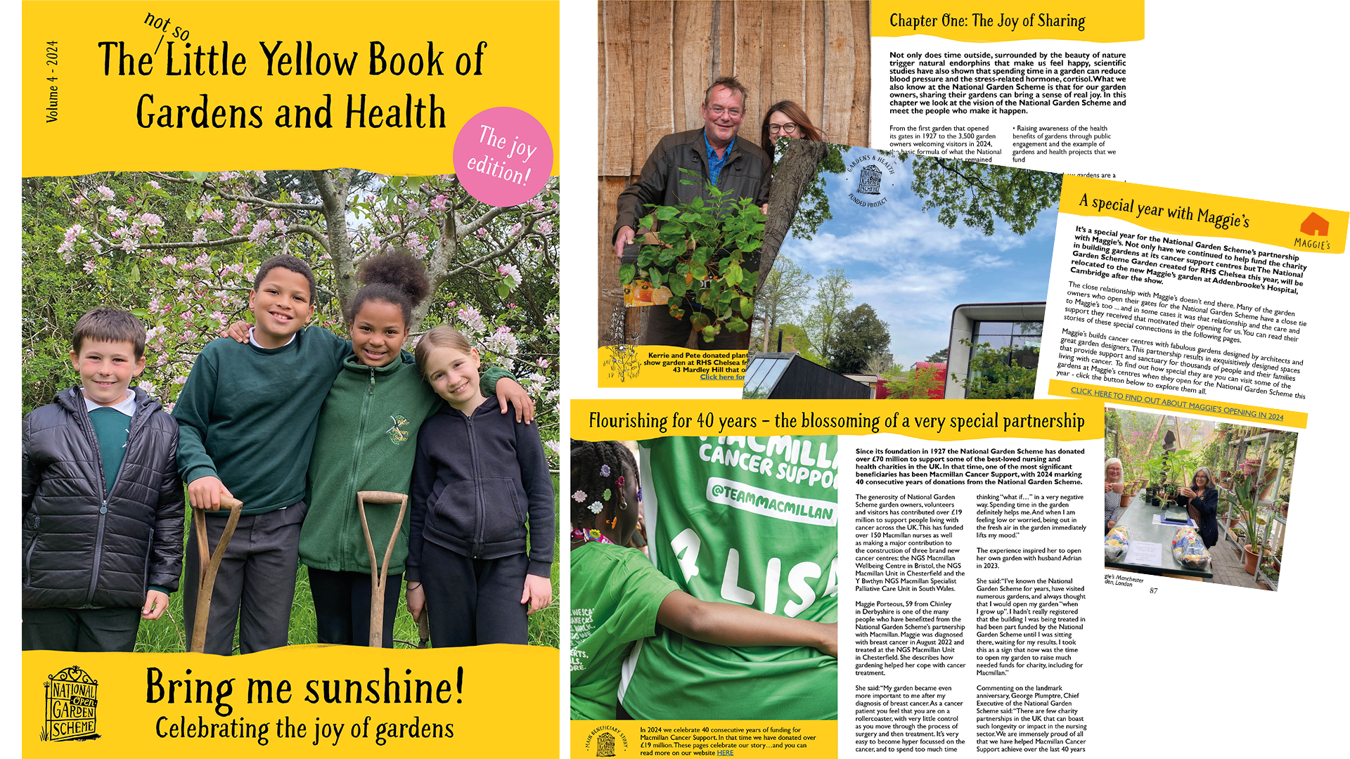 Each year we publish a digital booklet to mark Gardens and Health Week, bringing together all that is good about gardens. In 2024 we’re delighted to share our Little Yellow Book of Gardens and Health ‘The Joy Edition’ celebrating the joy that gardens and gardening bring to so many.