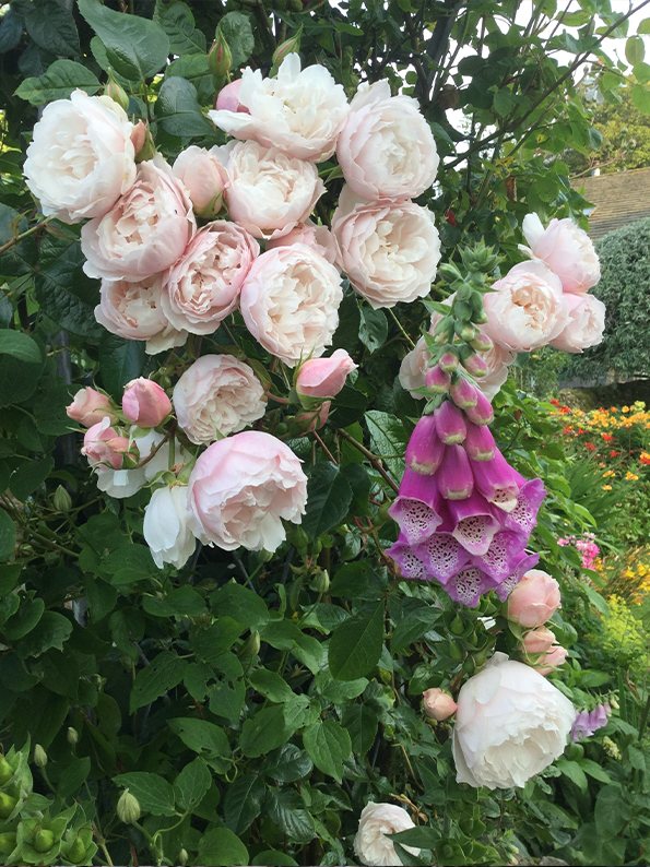 David Austin roses grace many of the gardens that open for the National Garden Scheme. Our lead image shows The Generous Gardener at 15 Waite Davies Road, London opening in June 2022 – click here for more information and below seen with foxgloves at 3 The Barns in Ilkley, West Yorkshire opening in July 2022 – click here for more information.