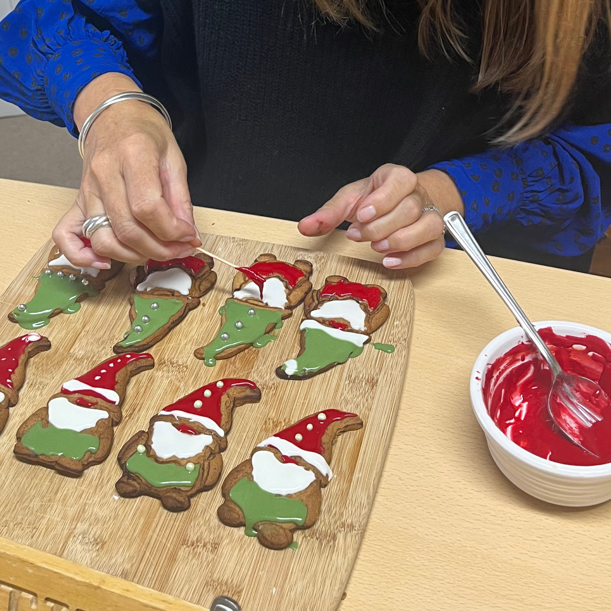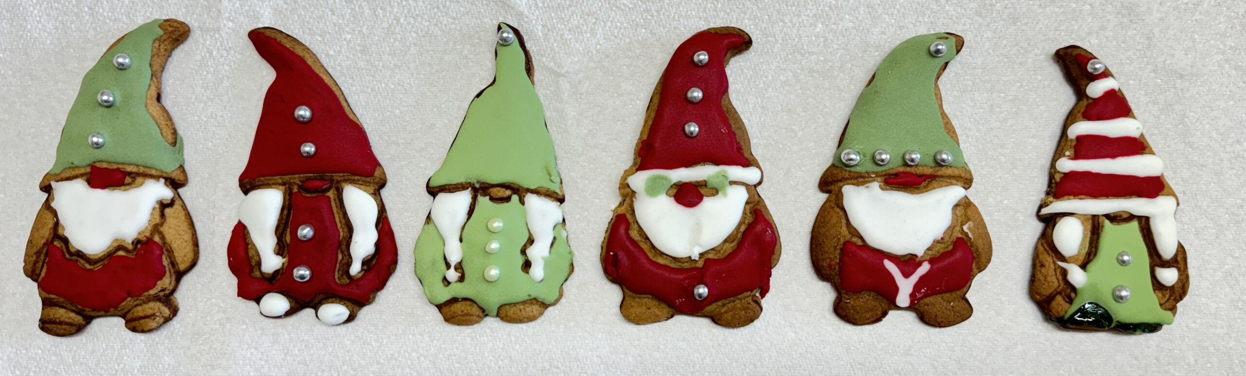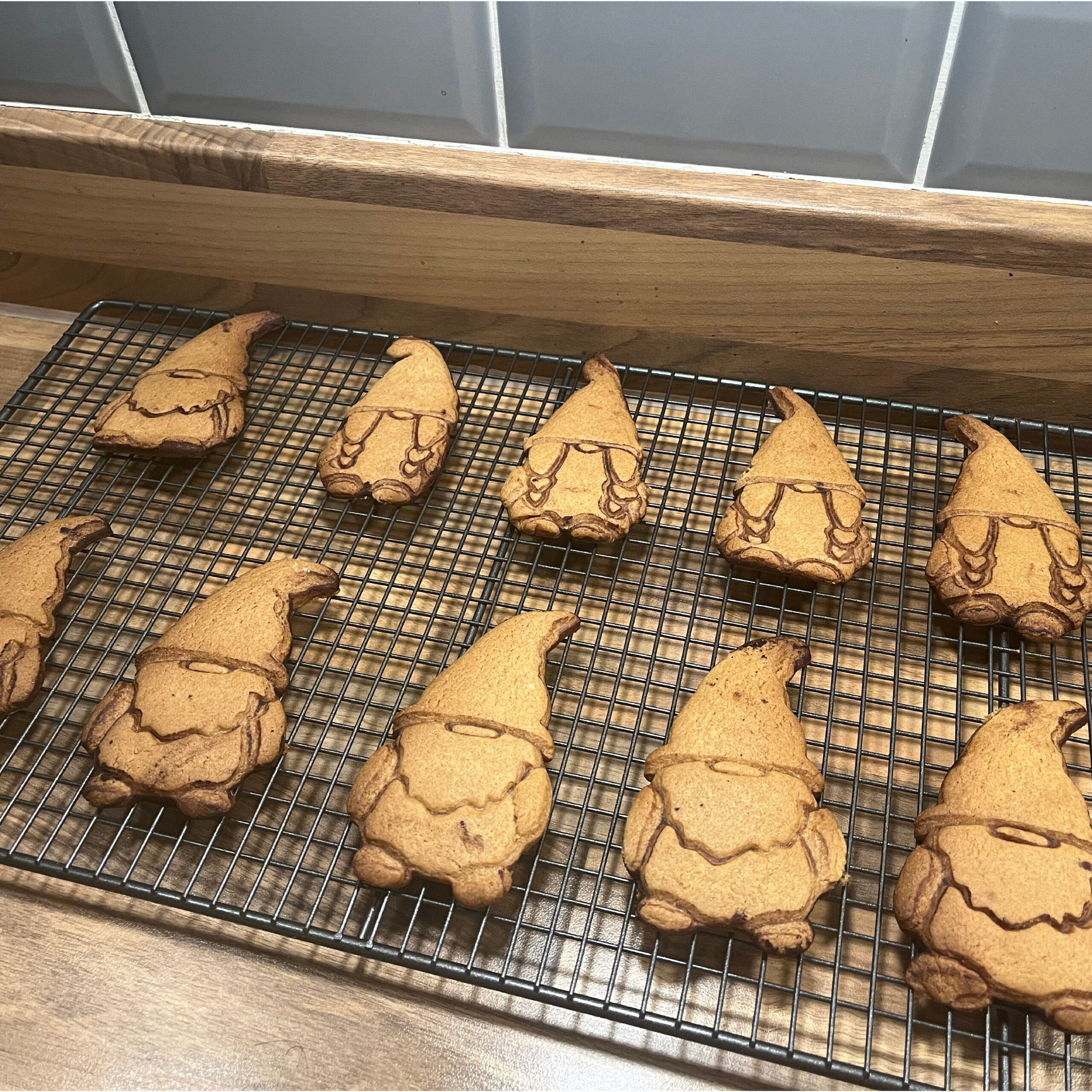 Go big or go gnome! We thought we’d have a bit of seasonal fun with our gingerbread biscuit recipe and jazz up a gnome for Christmas. We used a shaped cookie cutter with an indented pattern on the inside which we dusted with cocoa powder to highlight the outlines. They look and taste pretty good without icing but if you want some fun (and to make a bit of mess!) give the decorating a go!