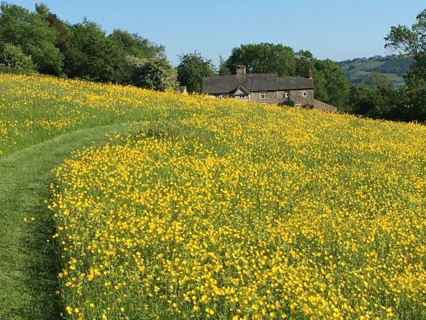 In the face of the catastrophic loss of 97% of our wildflower meadows since the 1930s, the plan was to create new and restored meadows using donor seed from remaining fragments of ancient and traditional meadows. Working together, The Wildlife Trusts and Plantlife identified 60 species-rich meadows, one for every year of the Queen’s reign at that time. One is at Hurdley Hall in Wales, and forms part of a wider garden landscape that opens for the National Garden Scheme.