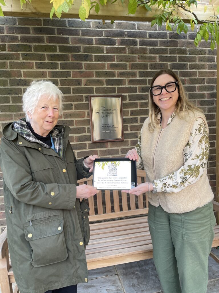 As part of the National Garden Scheme’s funding, each community garden is presented with a commemorative plaque and on Monday 17 November, Surrey County Organiser, Clare Bevan presented a plaque to Kas Girdler, Community Engagement Manager at The Fountain Centre.