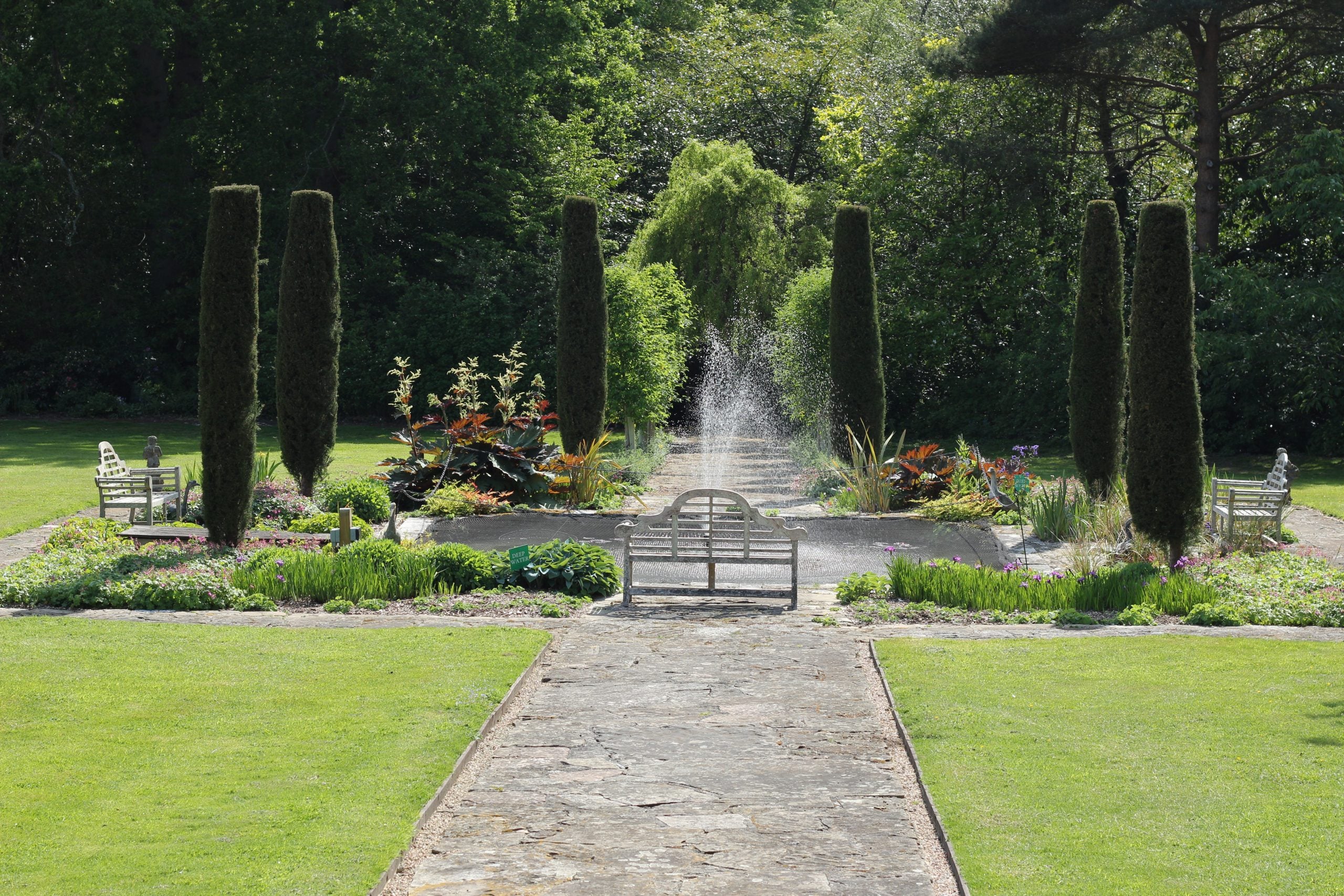Wandering up the path, the first of these rooms is a long, formal lawn with a pond in its centre. Speckled around its edges, purple iris add pops of colour and yew clipped into pillars add height and structure to the scene.