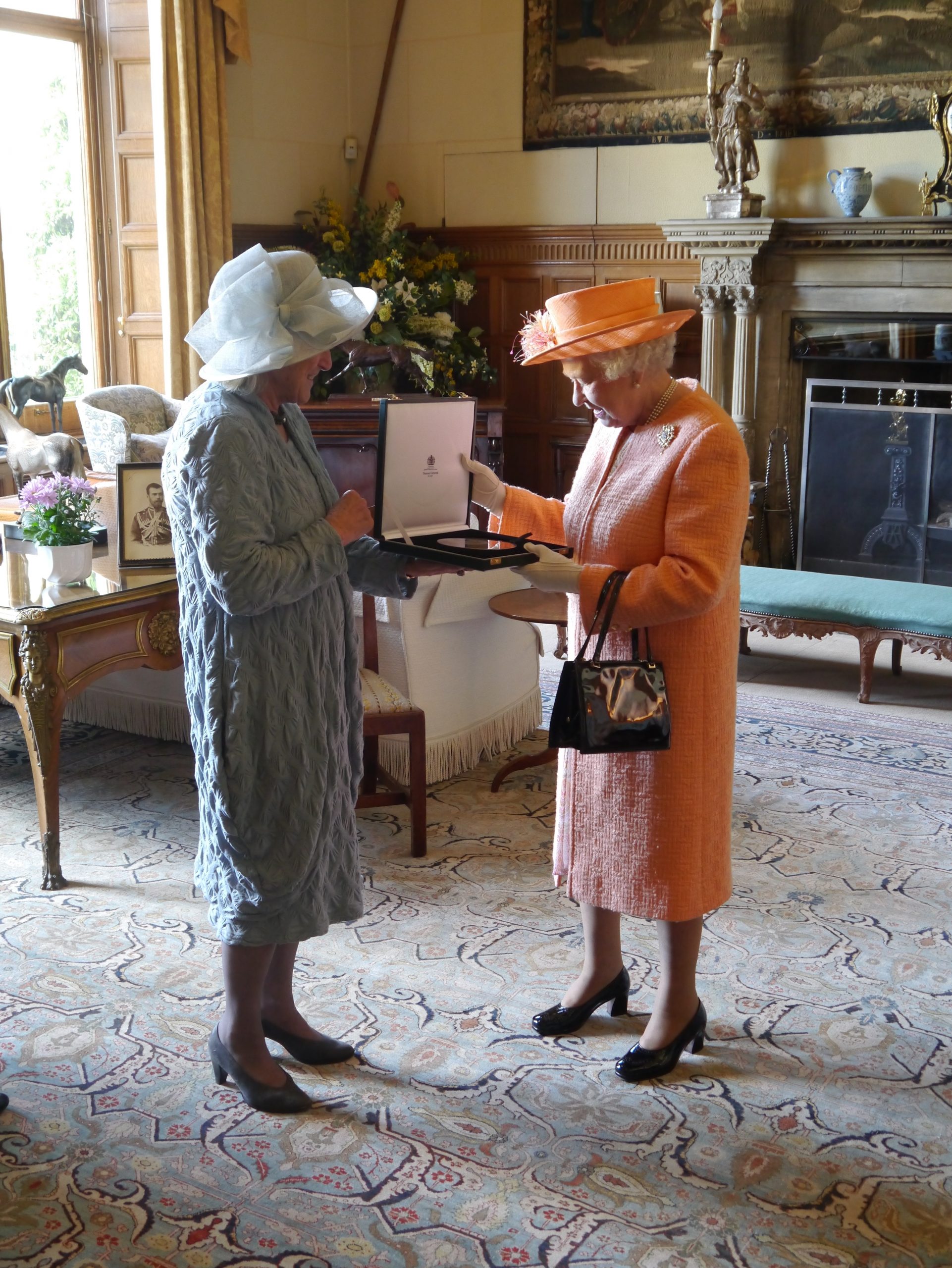 - Her Majesty receiving a special plaque from the charity’s chairman Penny Snell in 2012.