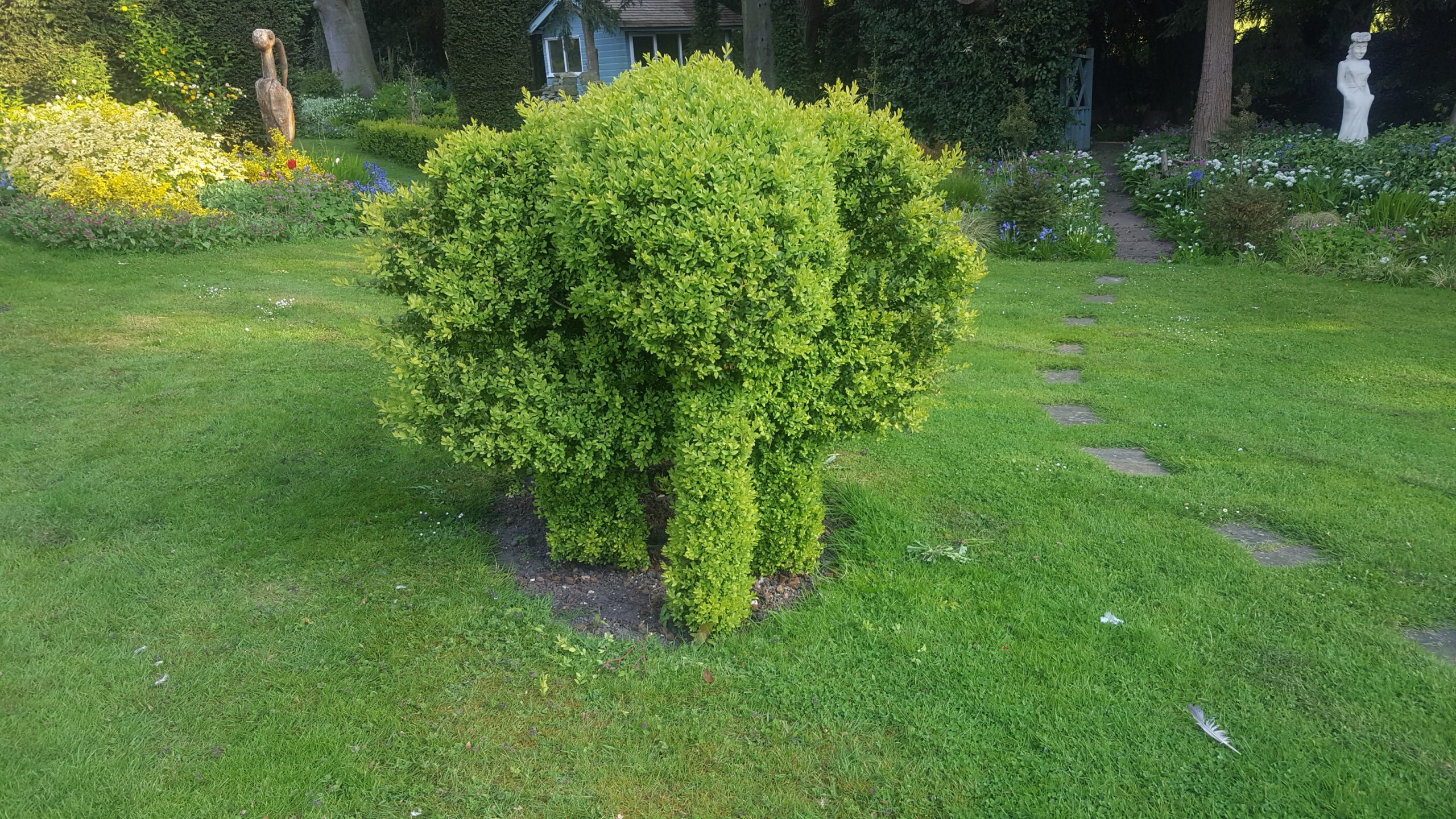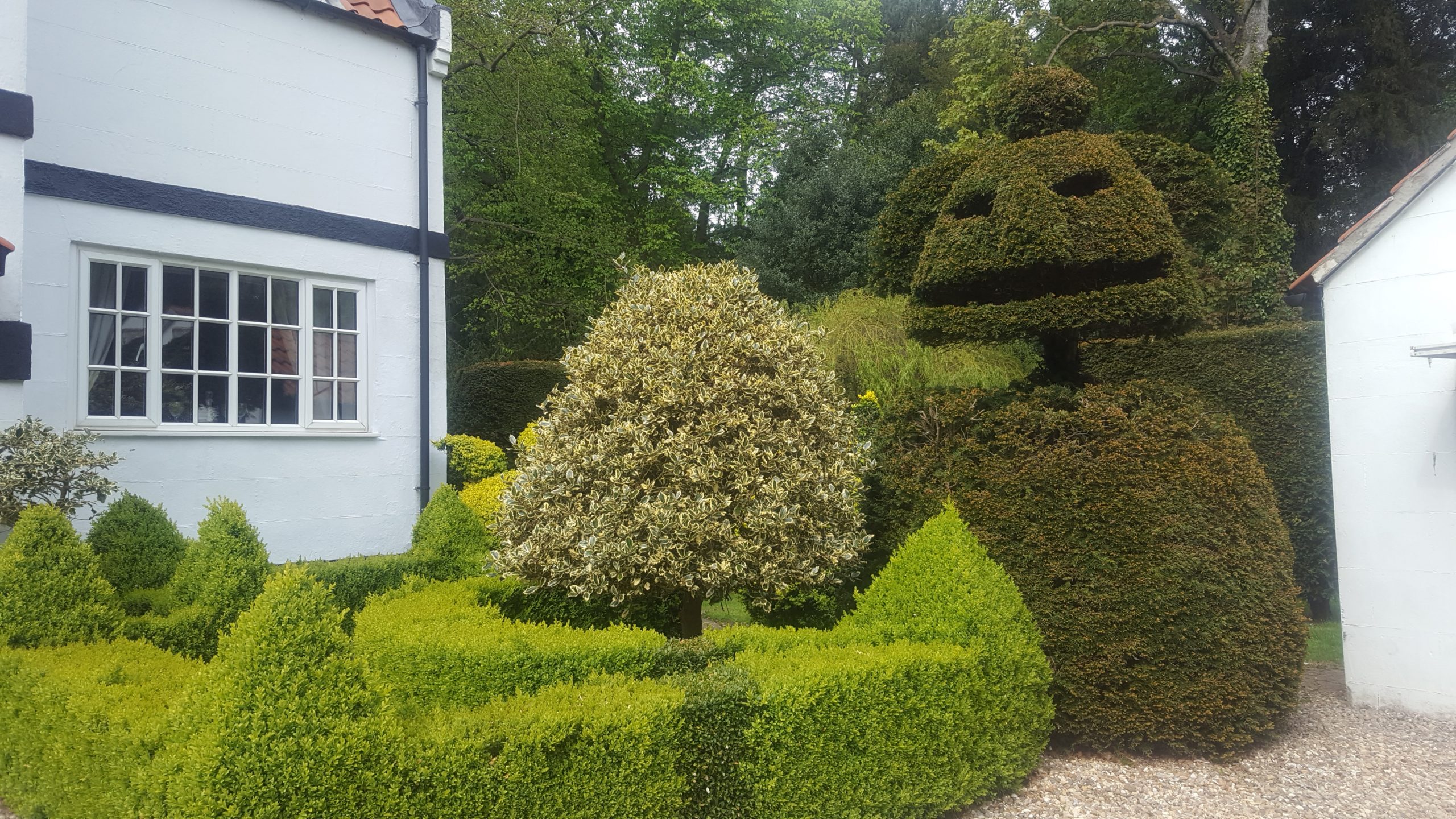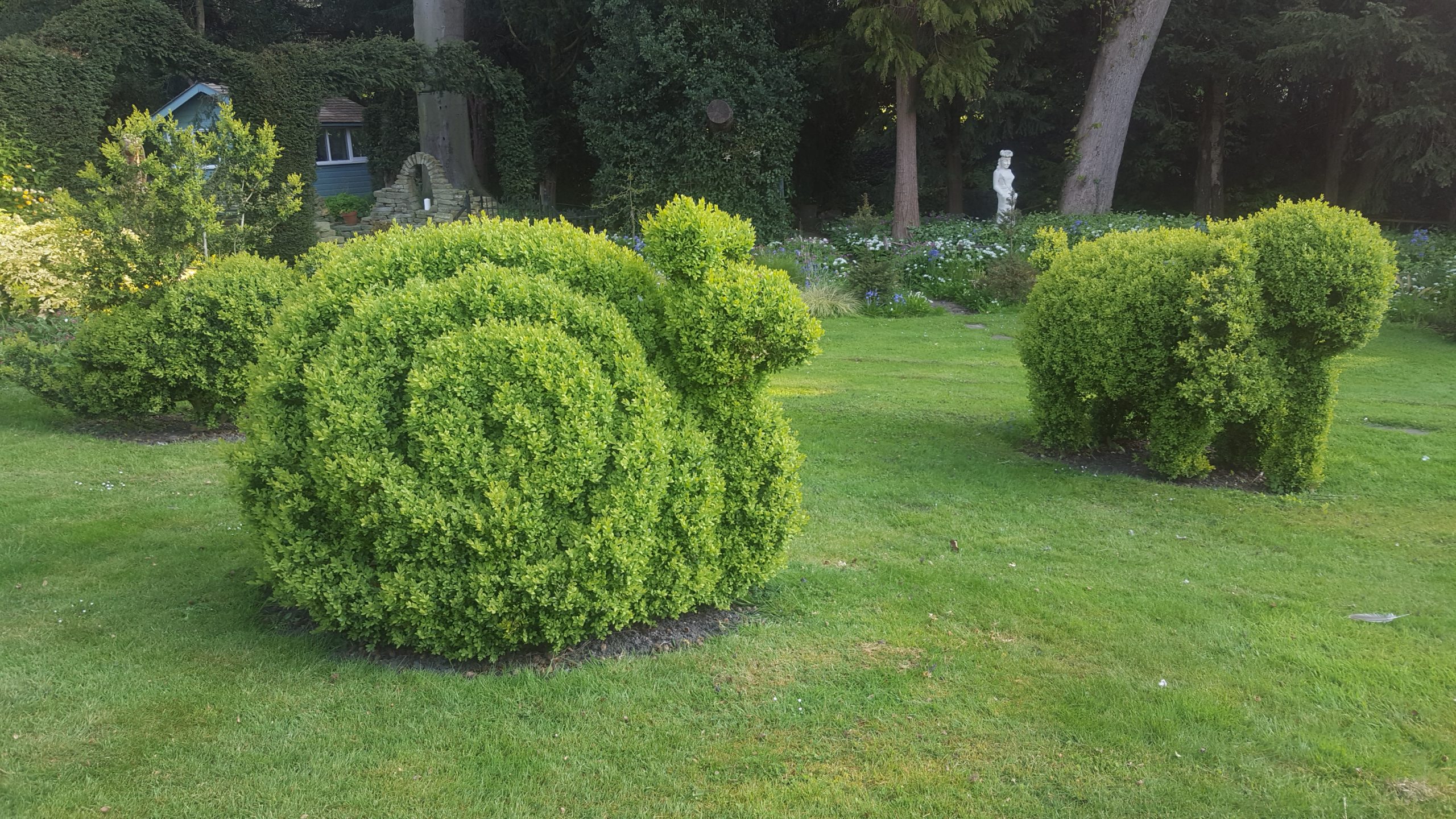 Box grows quickly and what started life as an ear on an animal can easily turn into a bush, so each year Debbie identifies strands that don’t contribute to the shape, maybe simply overlapping other branches behind, and removes them. The frame also grows and distorts the shape so every now and again the topiary needs a sever prune. Two years ago Debbie reshaped the swan which had lost its curves; the teapot started life as a camel until the humps were impossible to shape. This year as Highfield Cottage is unable to open for the National Garden Scheme Debbie is going to tackle a couple of bushes to get them back where they should be, they won’t look pristine for a couple of years but will recover to look better than ever.