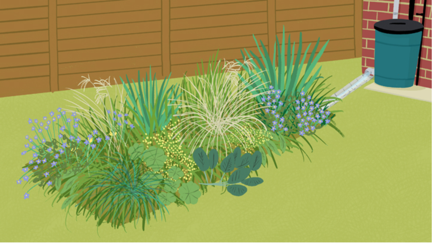 The rainwater is then allowed to run into a rain garden, which is designed to temporarily hold and soak up the rainwater so reducing the risk of flooding.