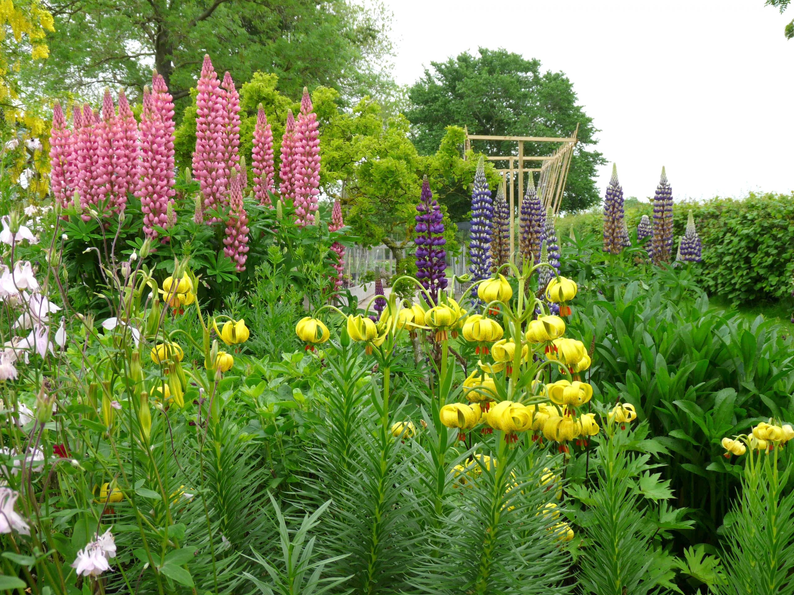 Sitting near the top of a hill we have had to think carefully about damage limitation from the prevailing, south-westerly wind. This entails the use of a wide variety of plant supports and choosing plants that are likely to be more robust and less prone to wind damage. Hedges, trees and trellises help to slow the wind in different areas of the garden.
