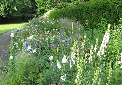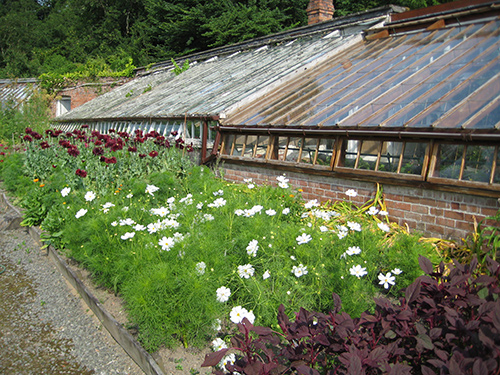 Covering six acres in all, the gardens at Llysdinam command sweeping views down the Wye Valley. Successive family members have developed the gardens over the last 150 years to include woodland with specimen trees, large herbaceous and shrub borders and a water garden, all of which provide varied and colourful planting throughout the year. The Victorian walled kitchen garden and extensive greenhouses grow a wide variety of vegetables, hothouse fruit and exotic plants.
