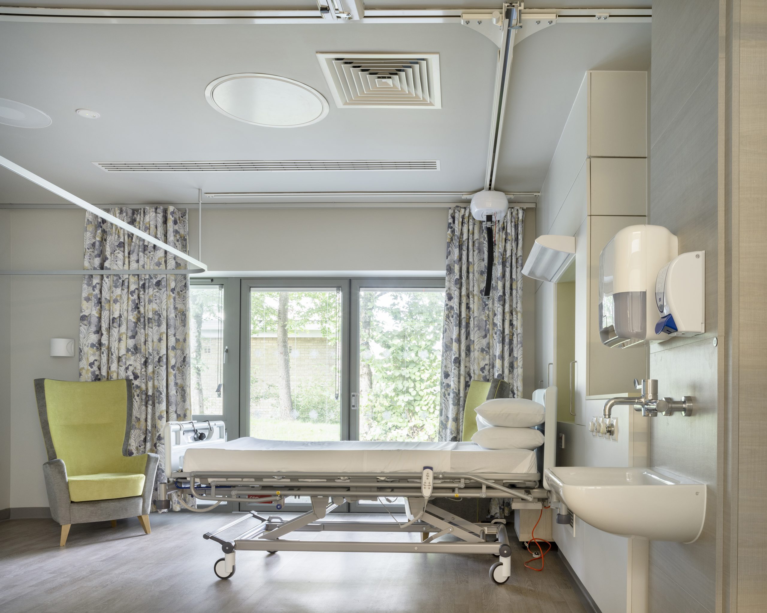 Each patient bedroom has doors designed so a patient’s bed can be taken outside onto a screened terrace if they wish to go outdoors.