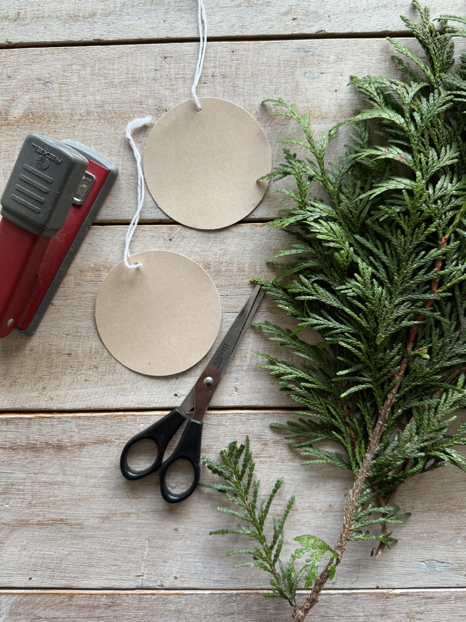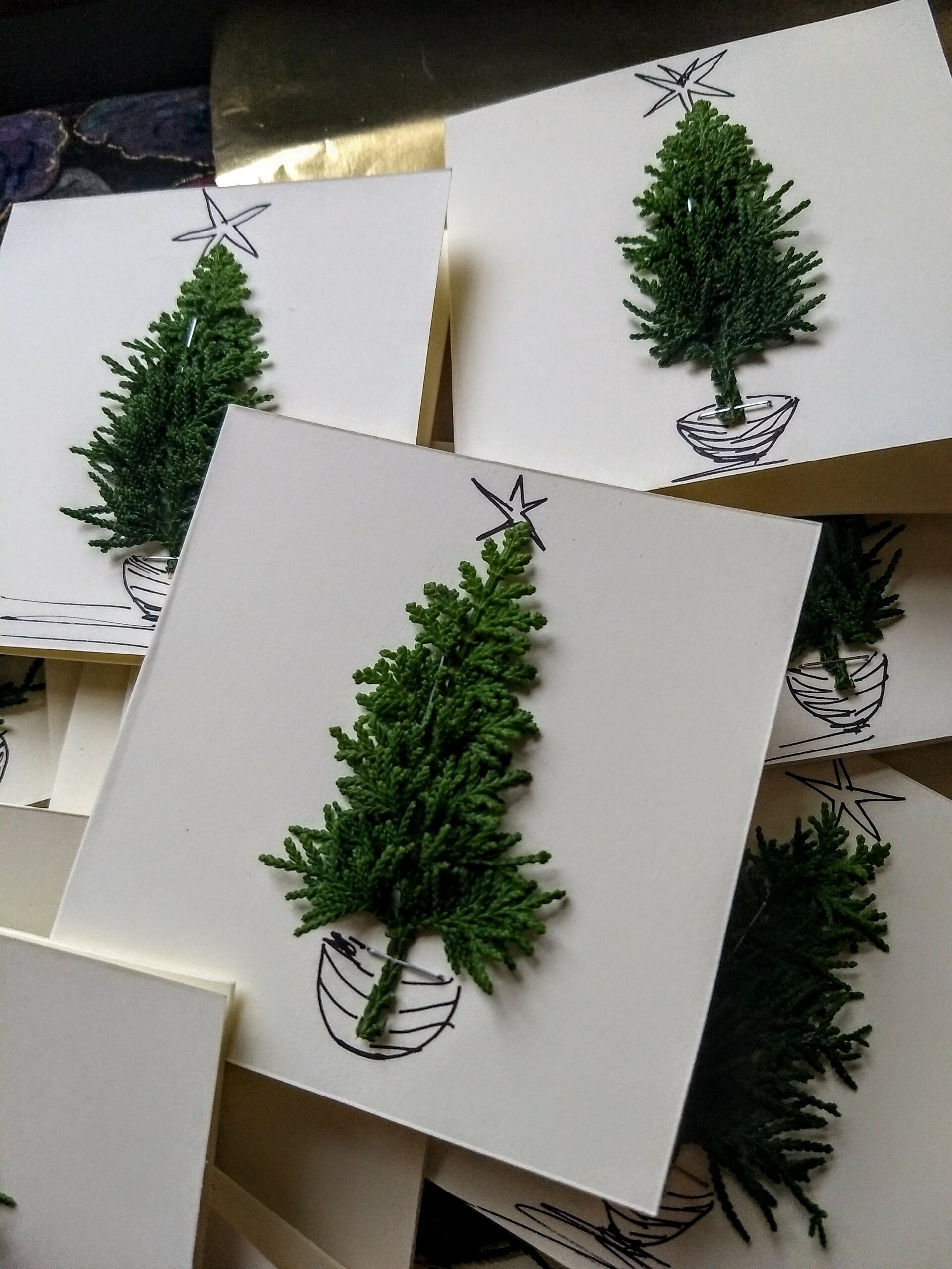 We love these super simple ideas for cards and gift tags. All you need are some blank cards and tags and some conifer cuttings or fern fronds.