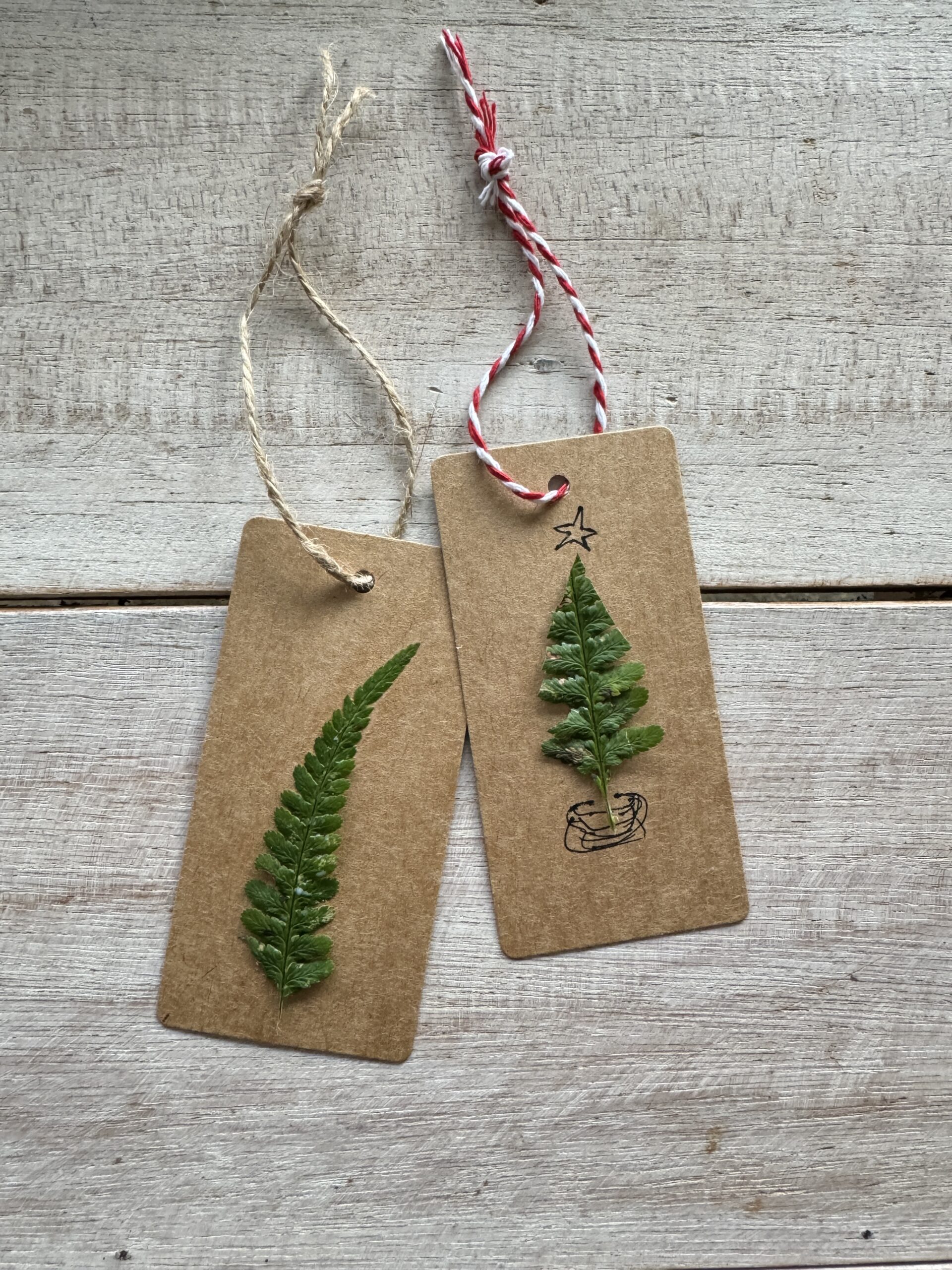 We simply glued the fern fronds to parcel tags, you can go over them with a coat of PVA glue to seal them or leave them fresh.