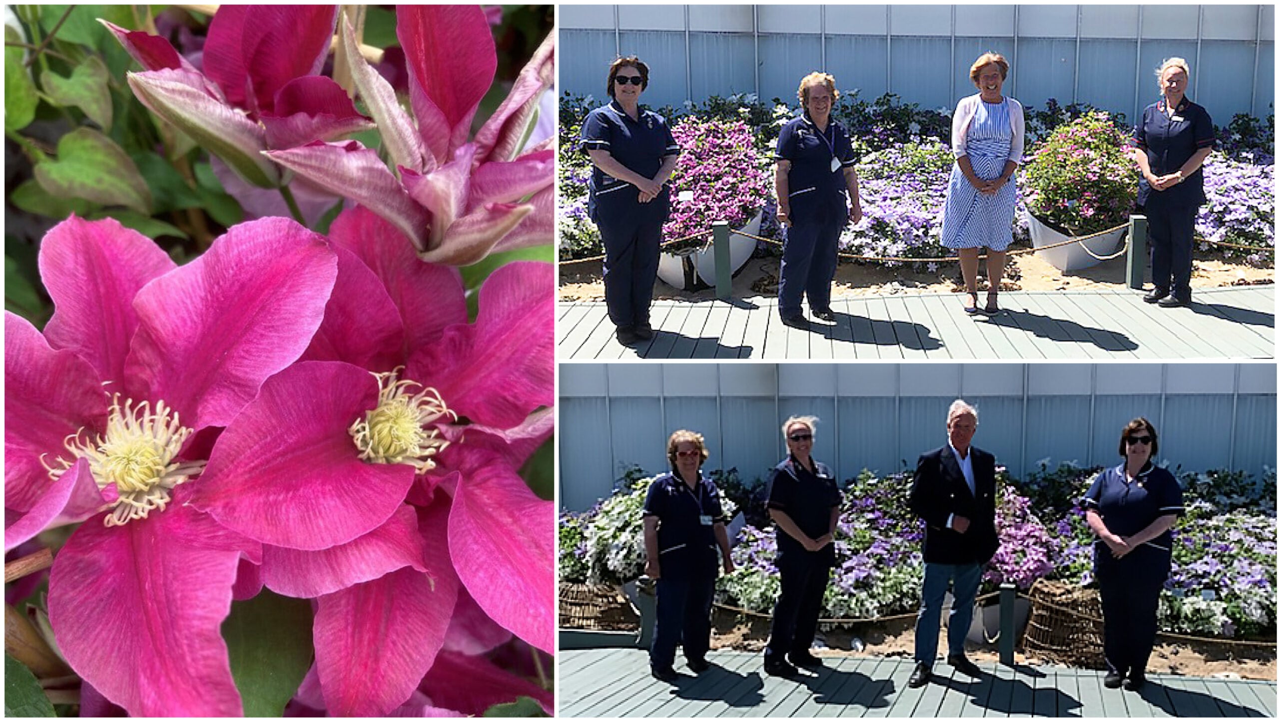 Clematis Queen’s Nurse EviGsy159(PBR) launching at RHS Chelsea Flower Show in May; Top L-R Alison Carney QN , Ellie Phillips QN, Lady Cordier ( Patron), Patricia McDermott QN; Bottom: 2020 L-R Ellie Phillips QN, Patricia McDermott QN, Mr Raymond Evison CBE, Alison Carney QN