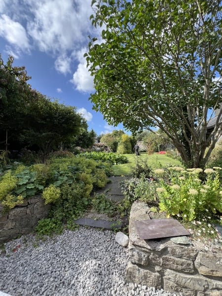 Primrose Cottage – Small cottage garden on south west facing sloped site, terraced with stone walls and steps to different areas- inc wildlife pond, raised ponds, gravel planting, small herbaceous borders, lawned area, mini orchard, Japanese style courtyard and seating areas. Lovingly developed over the years, still making mistakes and and still a work in progress. Opens By Arranagement.