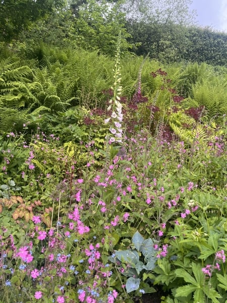 Dyffryn Mill – a rural garden which makes the most of its stunning setting. ‘Rewilding’ on a postage stamp with lake, pond, boggy scrapes and woodland planted in 2019. Hostas, ferns, corydalis, astilbes, epimediums abound and giant water tanks turned into planters to soften old industrial mill building. Wisteria and rambling roses, shrubbery, orchard, ‘hot’ slate bed. Wander along the river and through woodland. Opens 24 and 25 May.